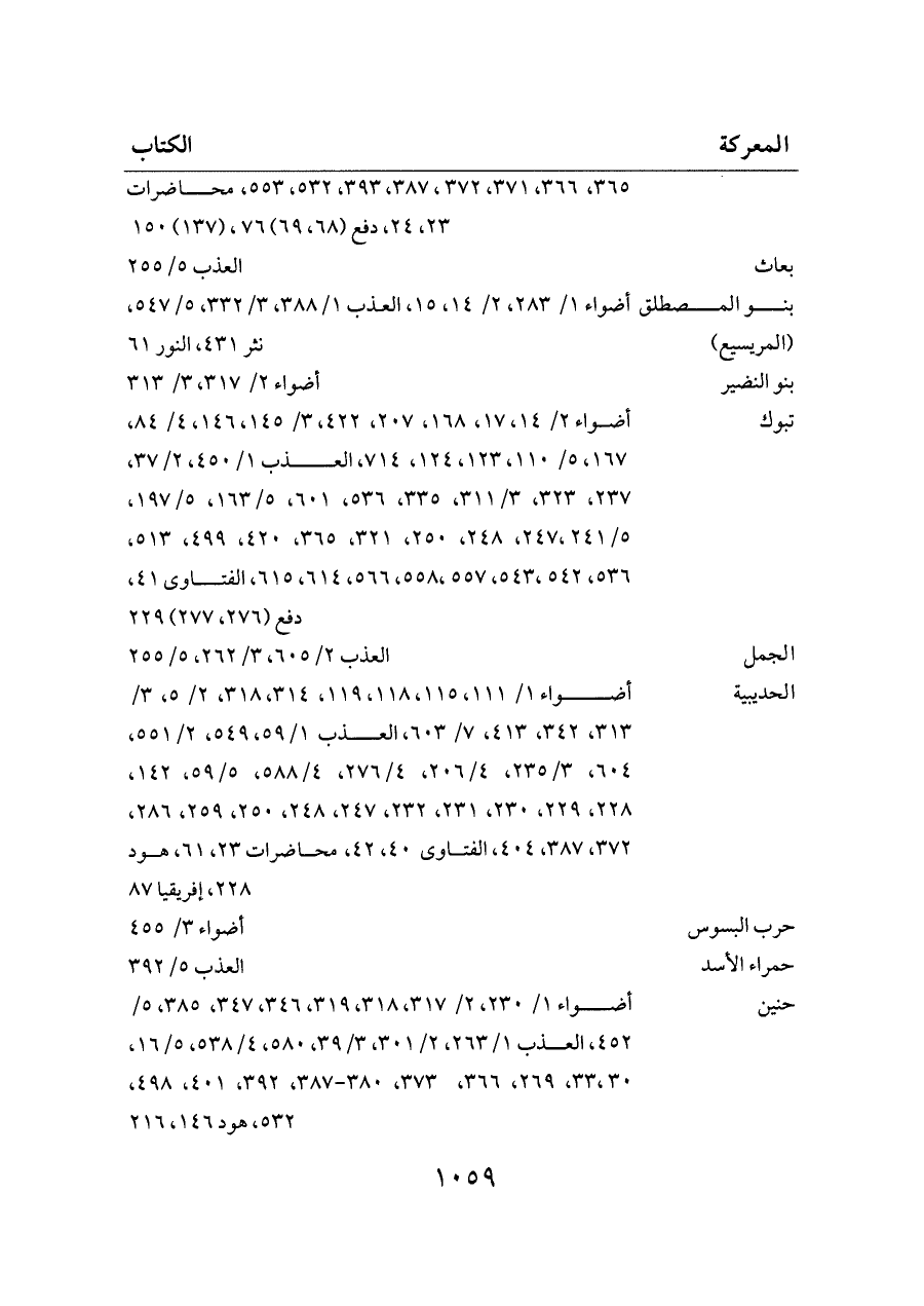 الحديبية ... أضواء ١/ ١١١، ١١٥، ١١٨، ١١٩، ٣١٤، ٣١٨، ٢/ ٥، ٣/ ٣١٣، ٣٤٢، ٤١٣، ٧/ ٦٠٣، العذب ١/ ٥٩، ٥٤٩، ٢/ ٥٥١، ٦٠٤، ٣/ ٢٣٥، ٤/ ٢٠٦، ٤/ ٢٧٦، ٤/ ٥٨٨، ٥/ ٥٩، ١٤٢، ٢٢٨، ٢٢٩، ٢٣٠، ٢٣١، ٢٣٢، ٢٤٧، ٢٤٨، ٢٥٠، ٢٥٩، ٢٨٦، ٣٧٢، ٣٨٧، ٤٠٤، الفتاوى ٤٠، ٤٢، محاضرات ٢٣، ٦١، هود ٢٢٨، إفريقيا ٨٧
