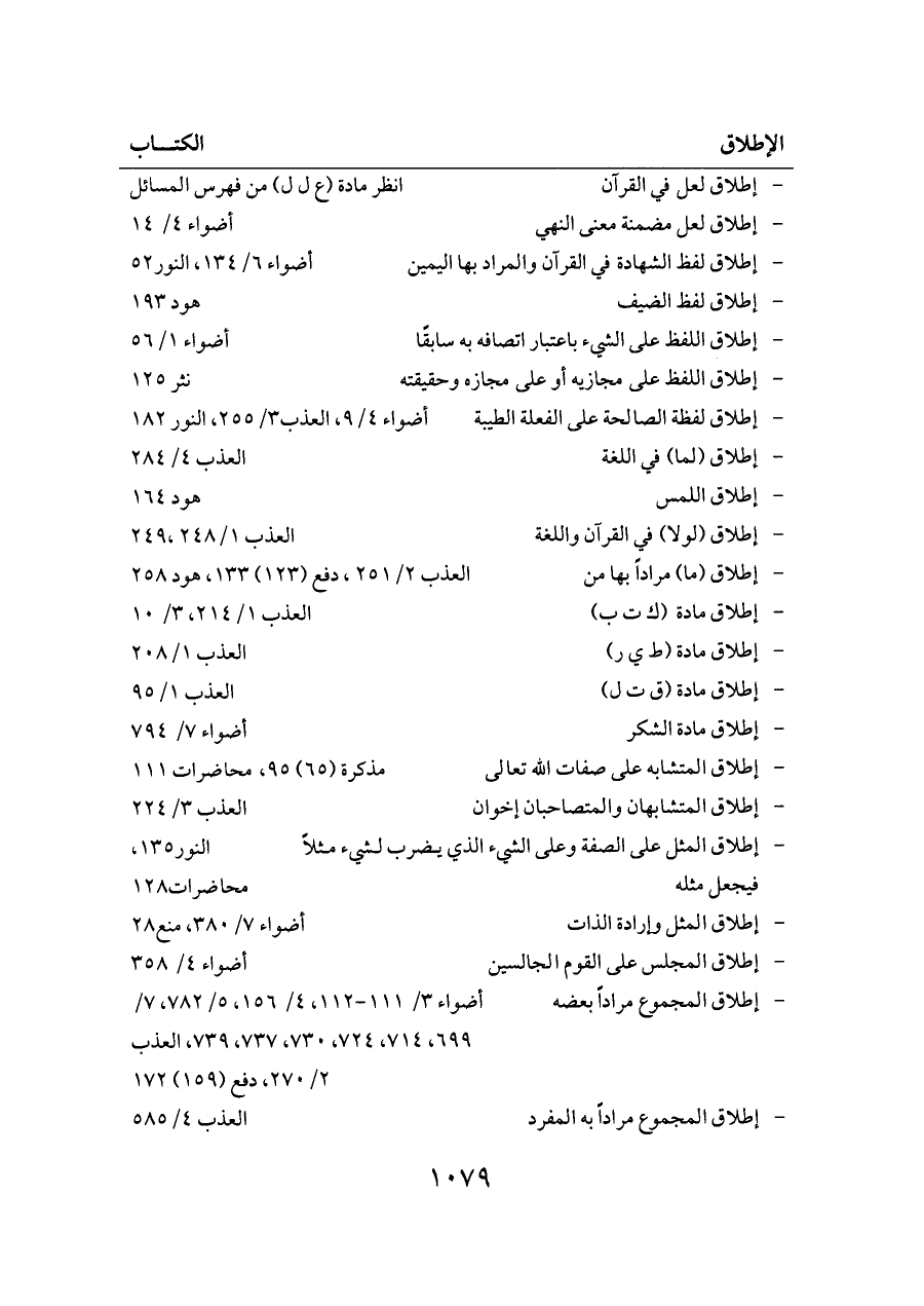 - إطلاق المجموع مراداً بعضه ... أضواء ٣/ ١١١ - ١١٢، ٤/ ١٥٦، ٥/ ٧٨٢، ٧/ ٦٩٩، ٧١٤، ٧٢٤، ٧٣٠، ٧٣٧، ٧٣٩، العذب ٢/ ٢٧٠، دفع (١٥٩) ١٧٢
