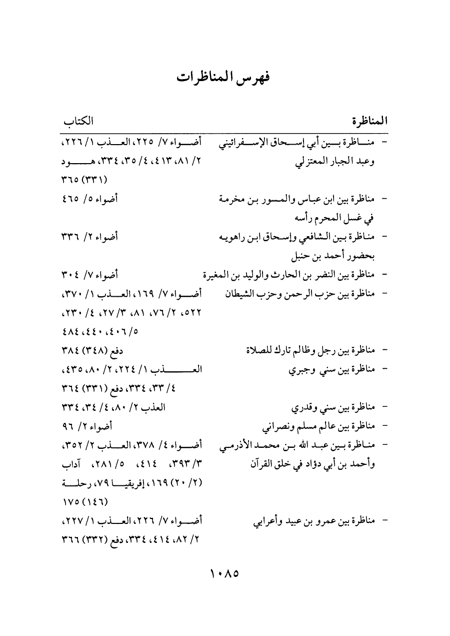 - مناظرة بين أبي إسحاق الإسفرائيني وعبد الجبار المعتزلي ... أضواء ٧/ ٢٢٥، العذب ١/ ٢٢٦، ٢/ ٨١، ٤١٣، ٤/ ٣٥، ٣٣٤، هود (٣٣١) ٣٦٥