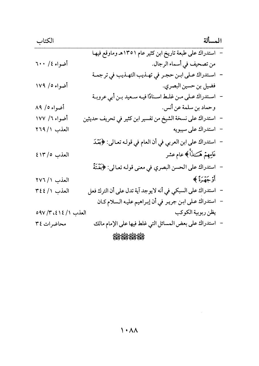 - استدراك على طبعة تاريخ ابن كثير عام ١٣٥١ هـ وماوقع فيها من تصحيف في أسماء الرجال. ... أضواء ٤/ ٦٠٠