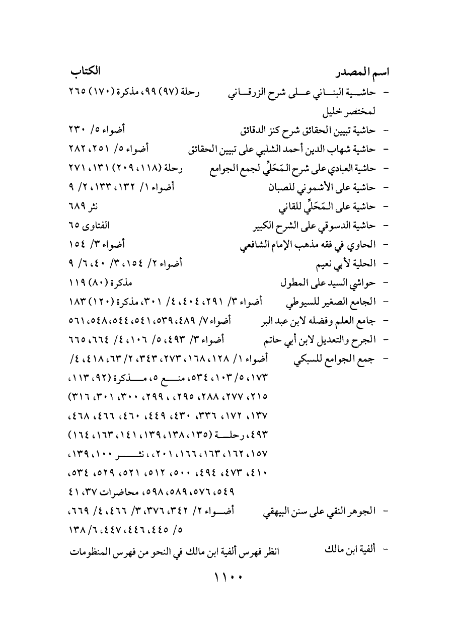 - جمع الجوامع للسبكي ... أضواء ١/ ١٢٨، ١٦٨، ٢٧٣، ٣٤٣، ٢/ ٦٣، ٤١٨، ٤/ ١٧٣، ٥/ ١٠٣، ٥٣٤، منع ٥، مذكرة (٩٢، ١١٣، ٢١٥، ٢٧٧، ٢٨٨، ٢٩٥،، ٢٩٩، ٣٠٠، ٣٠١، ٣١٦) ١٣٧، ١٧٢، ٣٣٦، ٤٣٠، ٤٤٩، ٤٦٠، ٤٦٦، ٤٦٨، ٤٩٣، رحلة (١٣٥، ١٣٨، ١٣٩، ١٤١، ١٦٣، ١٦٤) ١٥٧، ١٦٢، ١٦٣، ١٦٦، ٢٠١،، نثر ١٠٠، ١٣٩، ٤١٠، ٤٧٣، ٤٩٤، ٥٠٠، ٥١٢، ٥٢١، ٥٢٩، ٥٣٤، ٥٤٩، ٥٧٦، ٥٨٩، ٥٩٨، محاضرات ٣٧، ٤١