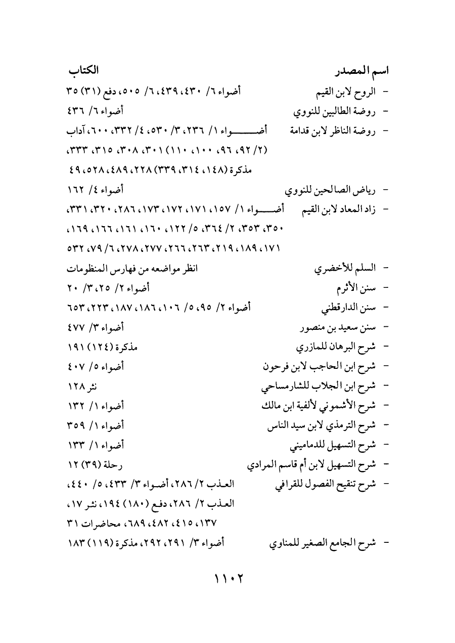- زاد المعاد لابن القيم ... أضواء ١/ ١٥٧، ١٧١، ١٧٢، ١٧٣، ٢٨٦، ٣٢٠، ٣٣١، ٣٥٠، ٣٥٣، ٢/ ٣٦٤، ٥/ ١٢٢، ١٦٠، ١٦١، ١٦٦، ١٦٩، ١٧١، ١٨٩، ٢١٩، ٢٦٣، ٢٦٦، ٢٧٧، ٢٧٨، ٦/ ٧٩، ٥٣٢