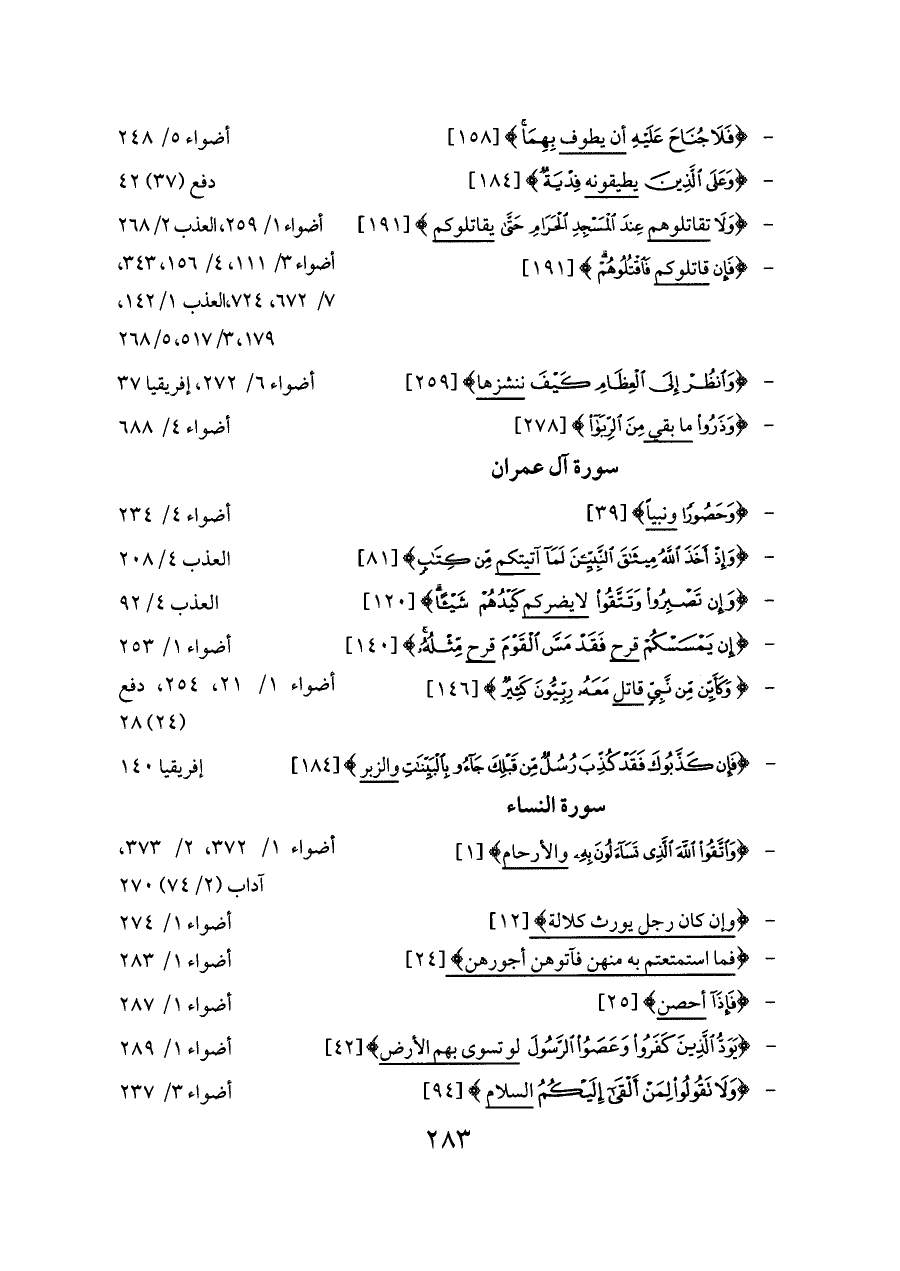- {وَلَا تقاتلوهم عِنْدَ الْمَسْجِدِ الْحَرَامِ حَتَّى يقاتلوكم} [١٩١] ... أضواء ١/ ٢٥٩، العذب ٢/ ٢٦٨