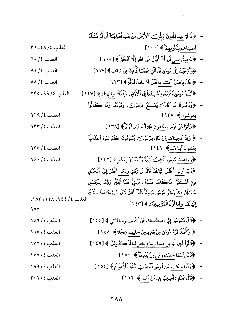 - {رَبِّ أرني أَنْظُرْ إِلَيْكَ قَالَ لَنْ تَرَانِي ولكن انْظُرْ إِلَى الْجَبَلِ فَإِنِ اسْتَقَرَّ مَكَانَهُ فَسَوْفَ تَرَانِي فَلَمَّا تَجَلَّى رَبُّهُ لِلْجَبَلِ جَعَلَهُ دكاً وَخَرَّ مُوسَى صَعِقًا فَلَمَّا أَفَاقَ قَالَ سُبْحَانَكَ تُبْتُ إِلَيْكَ وأنا أَوَّلُ الْمُؤْمِنِينَ} [١٤٣] ... العذب ٤/ ١٤٤، ١٤٨، ١٥٣، ١٥٥