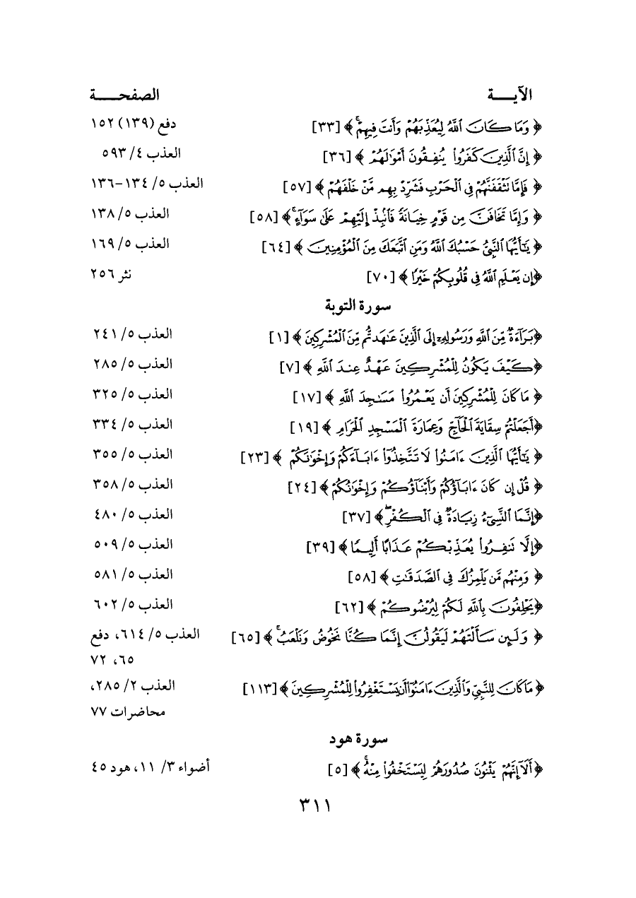 {مَا كَانَ لِلنَّبِيِّ وَالَّذِينَ آمَنُوا أَنْ يَسْتَغْفِرُوا لِلْمُشْرِكِينَ} [١١٣] ... العذب ٢/ ٢٨٥، محاضرات ٧٧