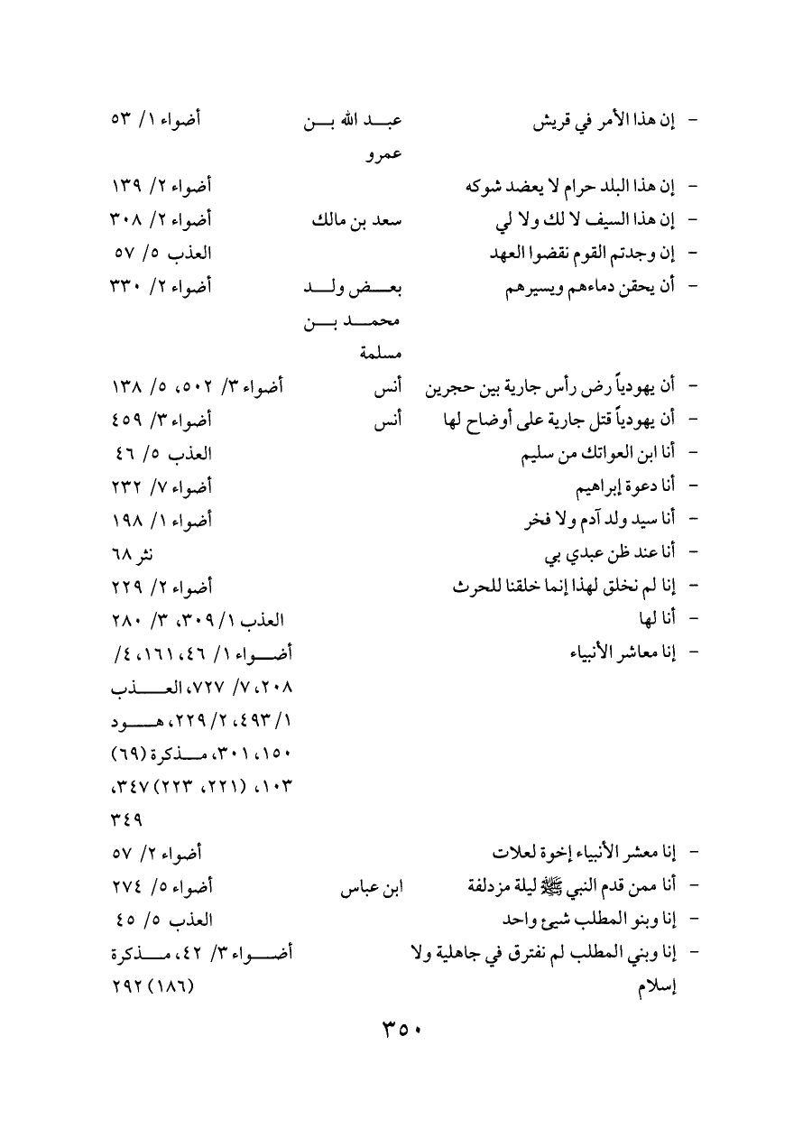- إنا معاشر الأنبياء ... أضواء ١/ ٤٦، ١٦١، ٤/ ٢٠٨، ٧/ ٧٢٧، العذب ١/ ٤٩٣، ٢/ ٢٢٩، هود ١٥٠، ٣٠١، مذكرة (٦٩) ١٠٣، (٢٢١، ٢٢٣) ٣٤٧، ٣٤٩