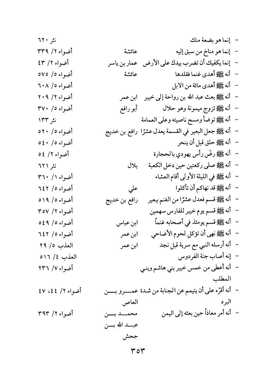 - أنه أعطى من خمس خيبر بني هاشم وبني المطلب ... أضواء ٧/ ٢٣٦