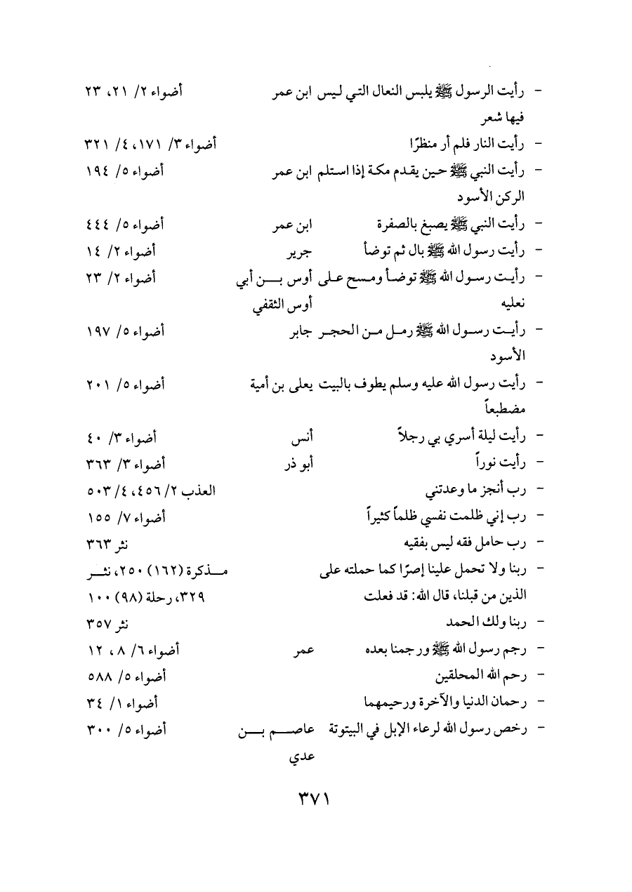 - رأيت الرسول - صلى الله عليه وسلم - يلبس النعال التي ليس فيها شعر ... ابن عمر ... أضواء ٢/ ٢١، ٢٣