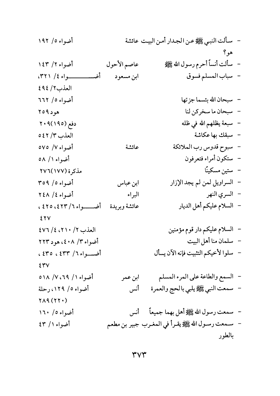 - سمعت النبي - صلى الله عليه وسلم - يلبي بالحج والعمرة ... أنس ... أضواء ٥/ ١٢٩، رحلة (٢٢٠) ٢٨٩