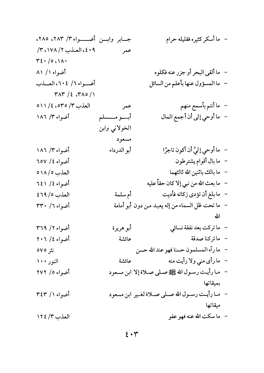- ما أسكر كثيره فقليله حرام ... جابر وابن عمر ... أضواء ٣/ ٢٨٣، ٢٨٥، ٤٠٩، العذب ٢/ ١٧٨، ٣/ ١٨٠، ٥/ ٣٤٠