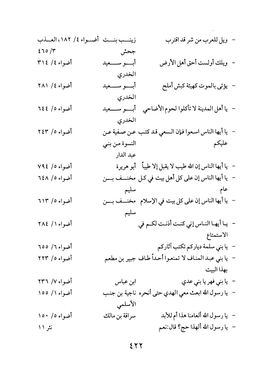- يا أيها الناس اسعوا فإن السعي قد كتب عليكم ... عن صفية عن النسوة من بني عبد الدار ... أضواء ٥/ ٢٤٣