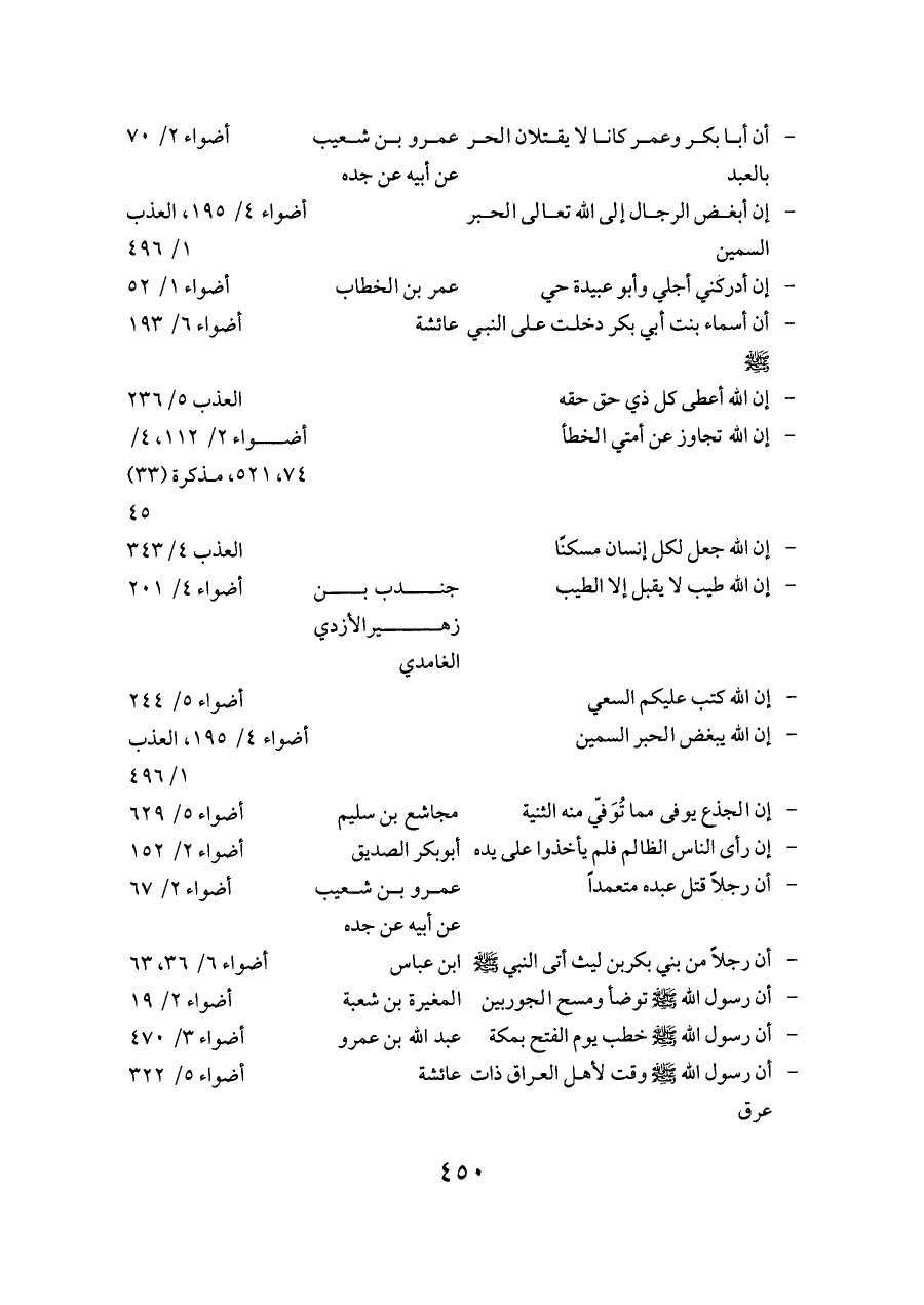 - أن أبا بكر وعمر كانا لا يقتلان الحر بالعبد ... عمرو بن شعيب عن أبيه عن جده ... أضواء ٢/ ٧٠