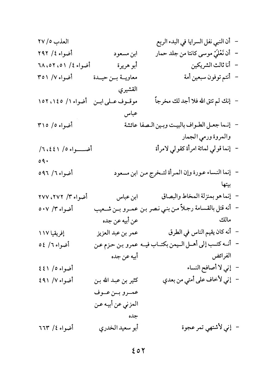 - أنه كتب إلى أهل اليمن بكتاب فيه الفرائض ... عمرو بن حزم عن أبيه عن جده ... أضواء ٦/ ٥٤