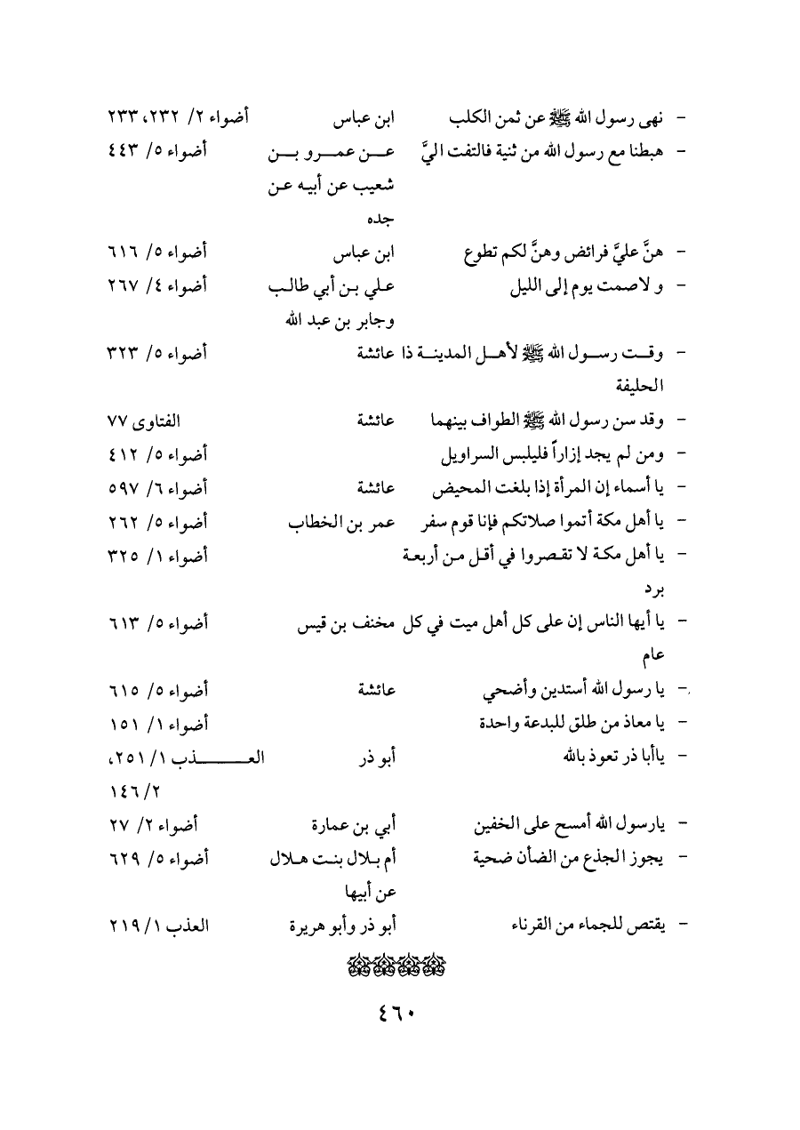 - هبطنا مع رسول الله من ثنية فالتفت اليَّ ... عن عمرو بن شعيب عن أبيه عن جده ... أضواء ٥/ ٤٤٣