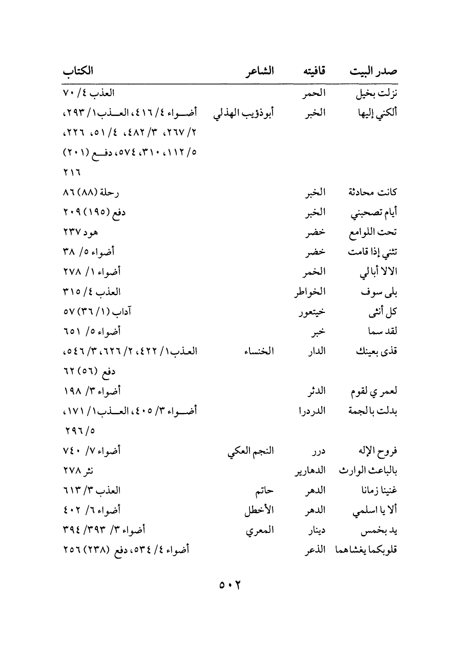 ألكني إليها ... الخبر ... أبوذؤيب الهذلي ... أضواء ٤/ ٤١٦، العذب ١/ ٢٩٣، ٢/ ٢٦٧، ٣/ ٤٨٢، ٤/ ٥١، ٢٢٦، ٥/ ١١٢، ٣١٠، ٥٧٤، دفع (٢٠١) ٢١٦