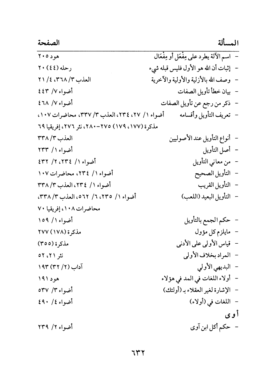 - تعريف التأويل وأقسامه ... أضواء ١/ ٢٧، ٢٣٤، العذب ٣/ ٣٣٧، محاضرات ١٠٧، مذكرة (١٧٧، ١٧٩) ٢٧٥ - ٢٨٠، نثر ٢٧٦، إفريقيا ٦٩