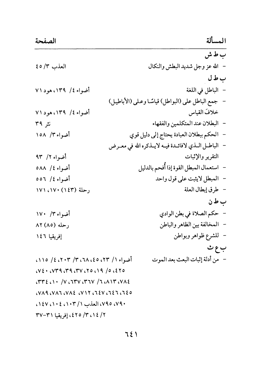 - جمع الباطل على (البواطل) قياسًا وعلى (الأباطيل) خلافَ القياس ... أضواء ٤/ ١٣٩، هود ٧١
