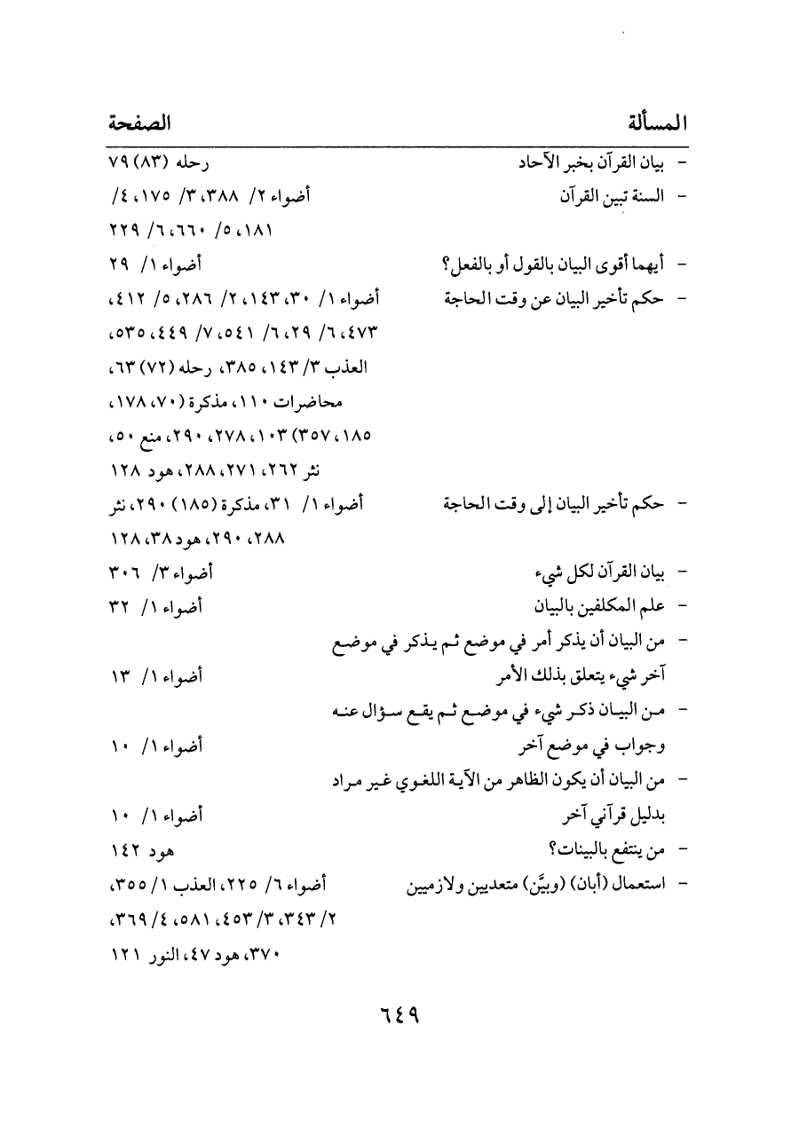- حكم تأخير البيان عن وقت الحاجة ... أضواء ١/ ٣٠، ١٤٣، ٢/ ٢٨٦، ٥/ ٤١٢، ٤٧٣، ٦/ ٢٩، ٦/ ٥٤١، ٧/ ٤٤٩، ٥٣٥، العذب ٣/ ١٤٣، ٣٨٥، رحله (٧٢) ٦٣، محاضرات ١١٠، مذكرة (٧٠، ١٧٨، ١٨٥، ٣٥٧) ١٠٣، ٢٧٨، ٢٩٠، منع ٥٠، نثر ٢٦٢، ٢٧١، ٢٨٨، هود ١٢٨
