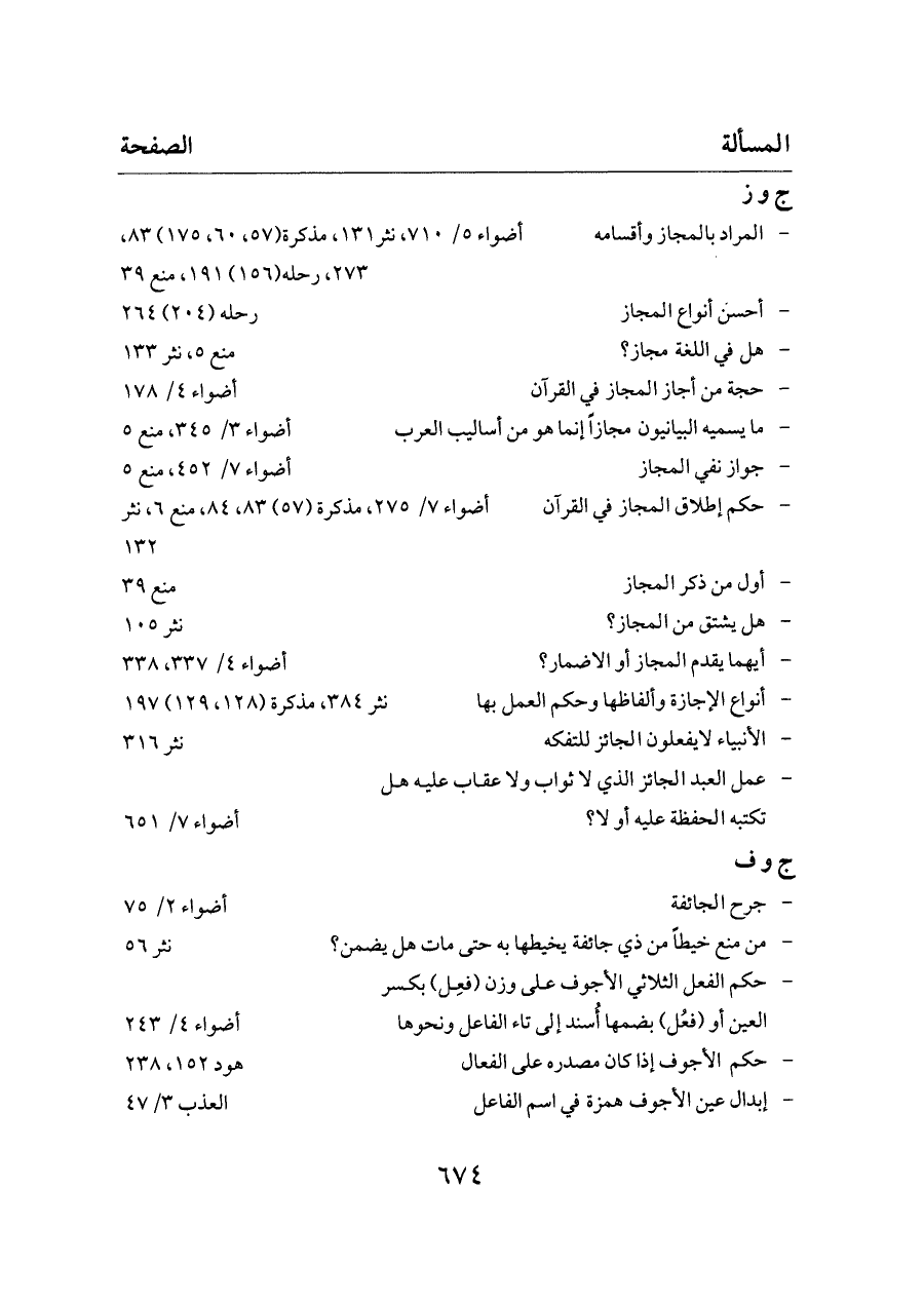 - المراد بالمجاز وأقسامه ... أضواء ٥/ ٧١٠، نثر ١٣١، مذكرة (٥٧، ٦٠، ١٧٥) ٨٣، ٢٧٣، رحله (١٥٦) ١٩١، منع ٣٩