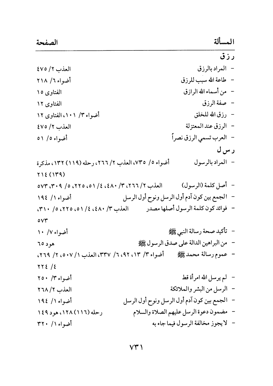 - أصل كلمة (الرسول) ... العذب ٢/ ٢٦٦، ٣/ ٤٨٠، ٤/ ٥١، ٢٢٥، ٥/ ٣٠٩، ٥٧٣