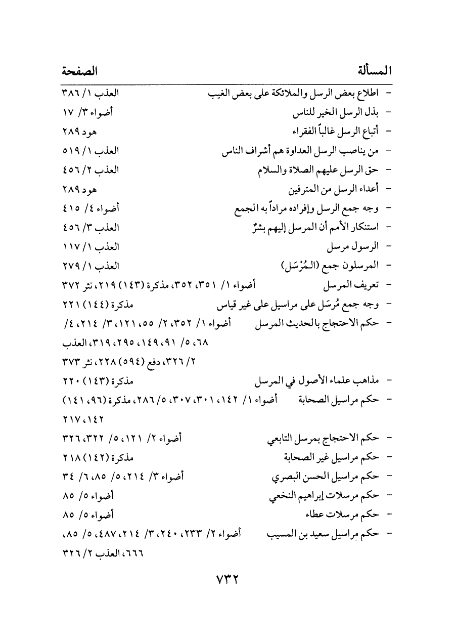 - حكم الاحتجاج بالحديث المرسل ... أضواء ١/ ٣٥٢، ٢/ ٥٥، ١٢١، ٣/ ٢١٤، ٤/ ٦٨، ٥/ ٩١، ١٤٩، ٢٩٥، ٣١٩، العذب ٢/ ٣٢٦، دفع (٥٩٤) ٢٢٨، نثر ٣٧٣