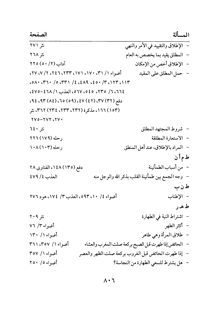 - حمل المطلق على المقيد ... أضواء ١/ ٣١، ١٧٠، ١٧١، ٢٣٣، ٢٤٦، ٢/ ٧، ٢٧، ١١٣، ١٢٣، ٣/ ٤٥٠، ٤٨٩، ٤/ ٣٣١، ٥/ ٣٦٠، ٥٨٠، ٦٦٤، ٦/ ٢٣٥، ٥٤٥، ٥٦٧، العذب ١/ ٤٦٨ - ٤٧٥، دفع (٣٢) ٣٧، (٤٢) ٤٧، (٥٩) ٦٥، (٨٤) ٩٣، ٩٤، (١٥٣) ١٦٦، مذكرة (٢٣٢، ٢٣٣، ٢٣٤) ٣٦٢، نثر ٢٧٠، ٢٧٢ - ٢٧٥