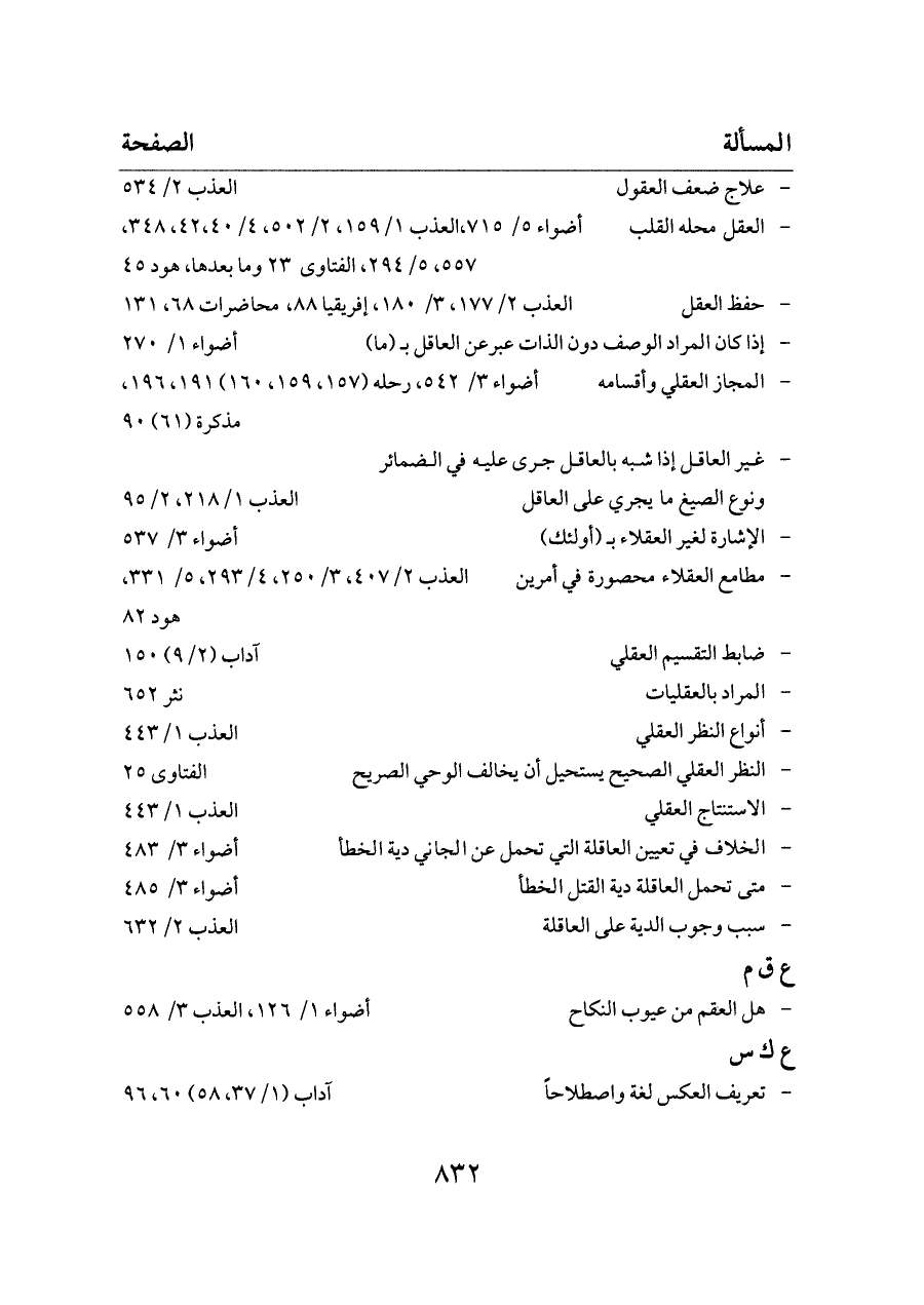 - العقل محله القلب ... أضواء ٥/ ٧١٥،العذب ١/ ١٥٩، ٢/ ٥٠٢، ٤/ ٤٢،٤٠، ٣٤٨، ٥٥٧، ٥/ ٢٩٤، الفتاوى ٢٣ وما بعدها، هود ٤٥