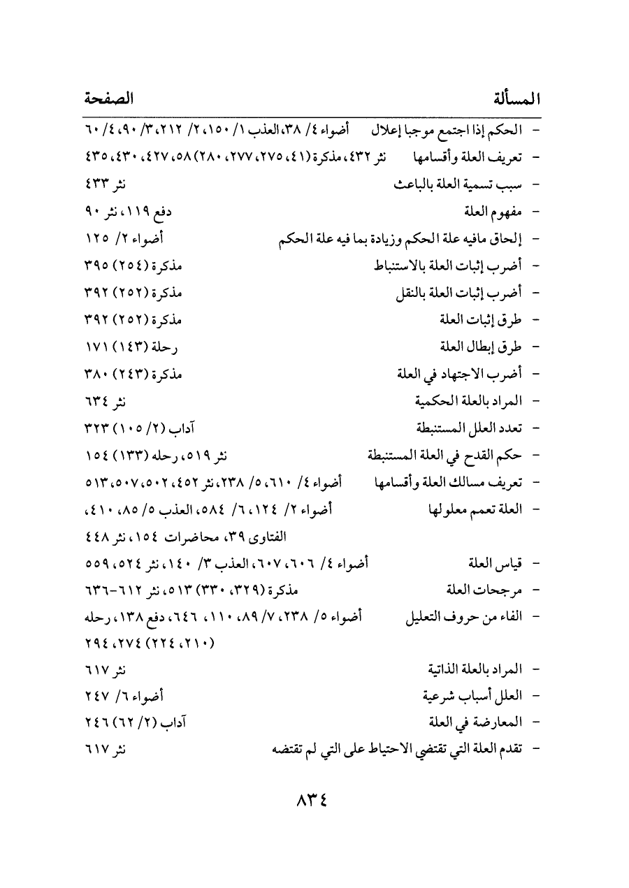- تعريف مسالك العلة وأقسامها ... أضواء ٤/ ٦١٠، ٥/ ٢٣٨، نثر ٤٥٢، ٥٠٢، ٥٠٧، ٥١٣