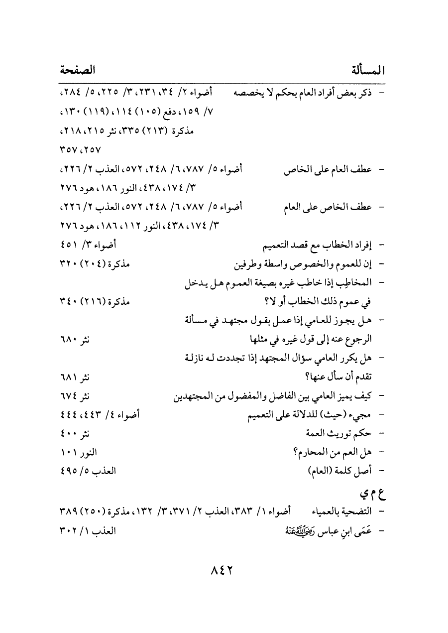 - ذكر بعض أفراد العام بحكم لا يخصصه ... أضواء ٢/ ٣٤، ٢٣١، ٣/ ٢٢٥، ٥/ ٢٨٤، ٧/ ١٥٩، دفع (١٠٥) ١١٤، (١١٩) ١٣٠، مذكرة (٢١٣) ٣٣٥، نثر ٢١٥، ٢١٨، ٢٥٧، ٣٥٧