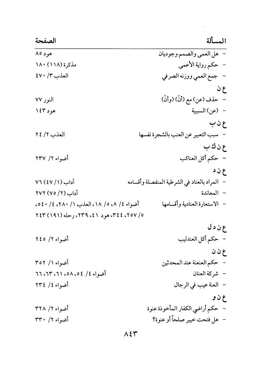 - الاستعارة العنادية وأقسامها ... أضواء ٤/ ٨، ٥/ ١٨، العذب ١/ ٢٨٠، ٤/ ٥٤٠، ٥/ ٢٥٧، ٣٤٤، هود ٤١، ٢٣٩، رحله (١٩١) ٢٤٣