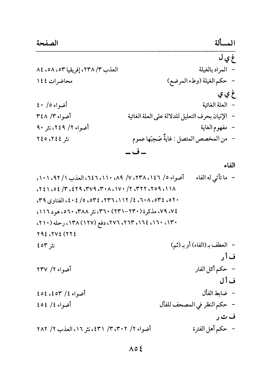 - ما تأتي له الفاء ... أضواء ٥/ ١٤٦، ٢٣٨، ٧/ ٨٩، ١١٠، ٦٤٦، العذب ١/ ٩٢، ١٠١، ١١٨، ٢٥٩، ٣٢٢، ٢/ ١٧٠، ٣٠٨، ٣٧٩، ٤٢٩، ٣/ ٥٤، ٢٤١، ٥٢٠، ٥٣٤، ٦٠٨، ٤/ ١١٢، ٢٣٦، ٥٣٤، ٥/ ٤٠٤، الفتاوى ٣٩، ٧٤، ٧٩، مذكرة (٢٣٠ - ٢٣١) ٣٦٠، نثر ٣٨٨، ٥٦٠، هود ١١٦، ١٣٠، ١٦٠، ١٦٤، ٢٦٣، ٢٧٦، دفع (١٢٧) ١٣٨، رحله (٢١٠، ٢٢٤) ٢٧٤، ٢٩٤