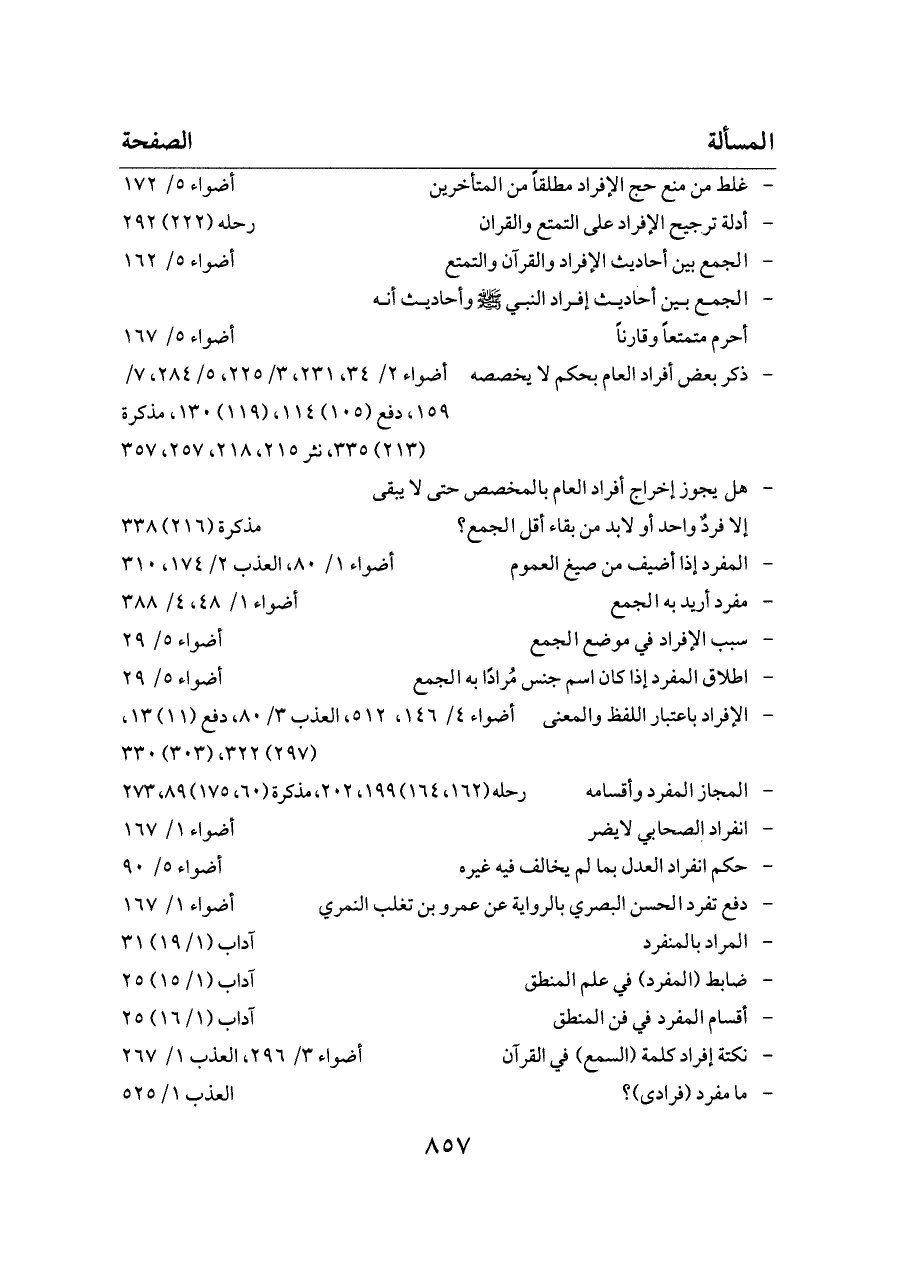 - الإفراد باعتبار اللفظ والمعنى ... أضواء ٤/ ١٤٦، ٥١٢، العذب ٣/ ٨٠، دفع (١١) ١٣، (٢٩٧) ٣٢٢، (٣٠٣) ٣٣٠