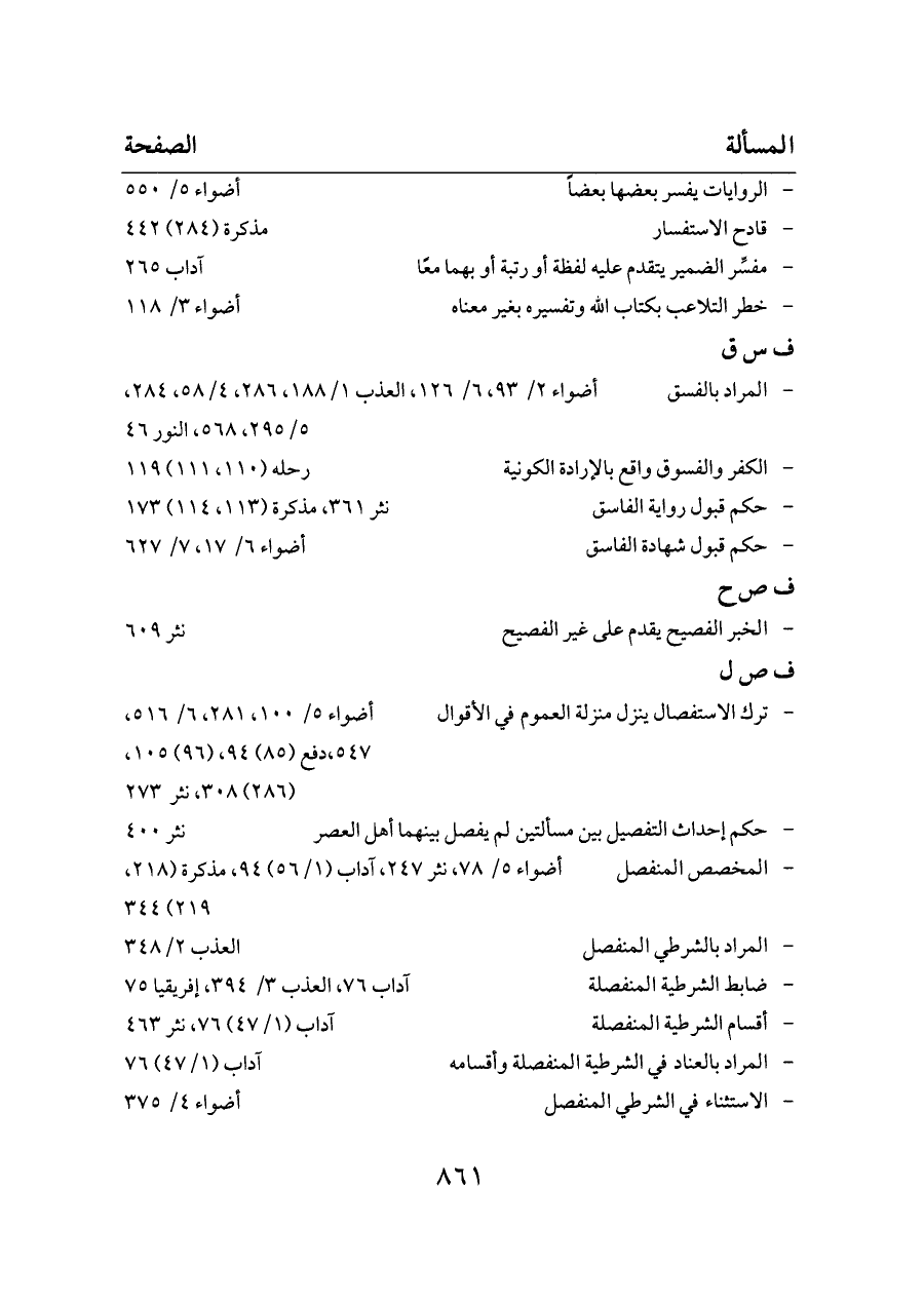 - المراد بالفسق ... أضواء ٢/ ٩٣، ٦/ ١٢٦، العذب ١/ ١٨٨، ٢٨٦، ٤/ ٥٨، ٢٨٤، ٥/ ٢٩٥، ٥٦٨، النور ٤٦