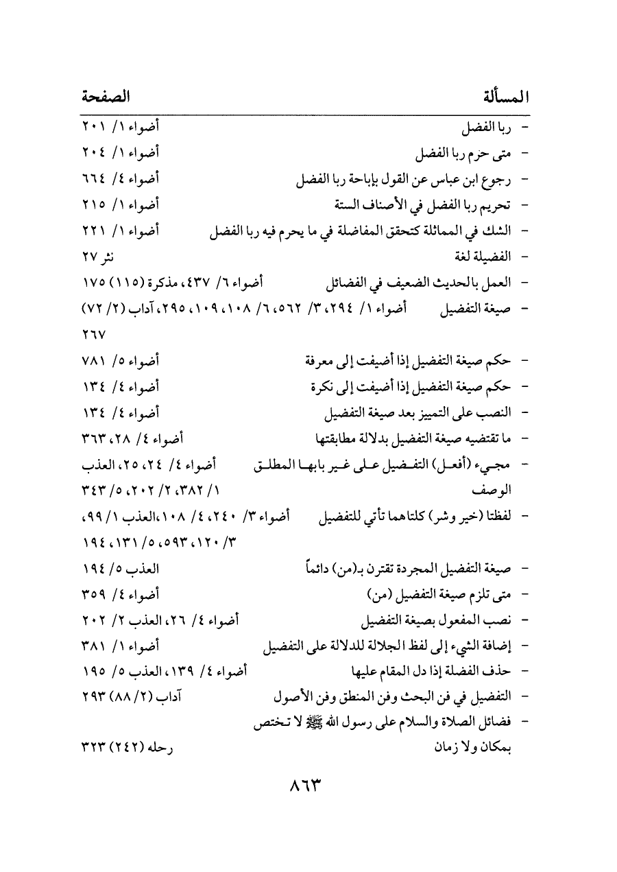 - مجيء (أفعل) التفضيل على غير بابها المطلق الوصف ... أضواء ٤/ ٢٤، ٢٥، العذب ١/ ٣٨٢، ٢/ ٢٠٢، ٥/ ٣٤٣