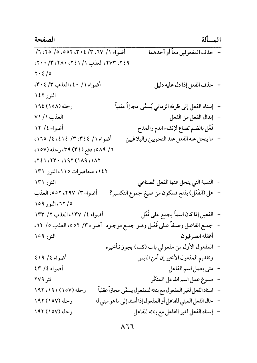 - حذف المفعولين معاً أو أحدهما ... أضواء ١/ ٦٧، ٣/ ٣٠٤، ٥٥٢، ٥/ ٢٥، ٦/ ٢٤٩، ٢٧٣، العذب ١/ ٢٤١، ٢٨٠، ٣/ ٢٠٠، ٥/ ٢٠٤