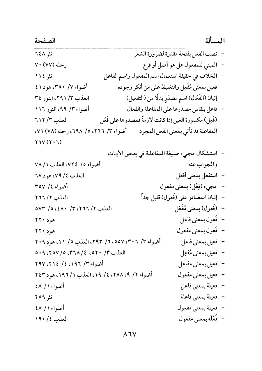 - فعيل بمعنى مفاعل ... أضواء ٣/ ١٩٦، ٤/ ٢١٤، ٢٩٧