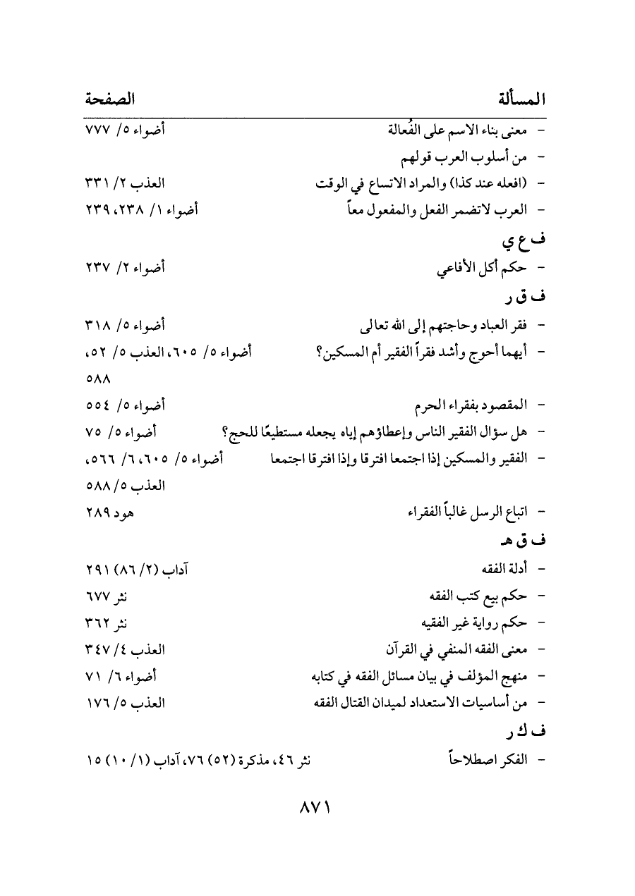 - أيهما أحوج وأشد فقراً الفقير أم المسكين؟ ... أضواء ٥/ ٦٠٥، العذب ٥/ ٥٢، ٥٨٨