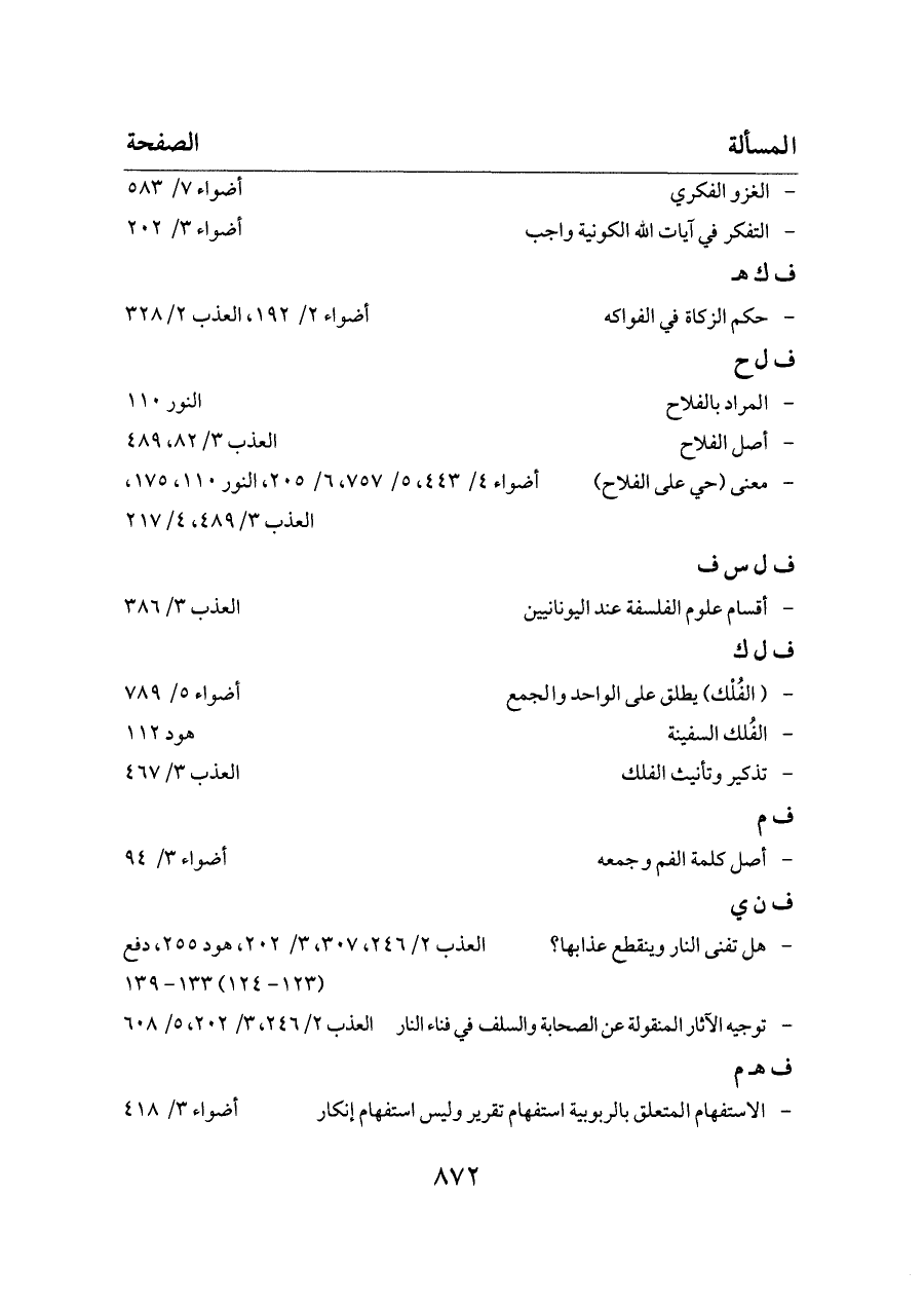 - هل تفنى النار وينقطع عذابها؟ ... العذب ٢/ ٢٤٦، ٣٠٧، ٣/ ٢٠٢، هود ٢٥٥، دفع (١٢٣ - ١٢٤) ١٣٣ - ١٣٩