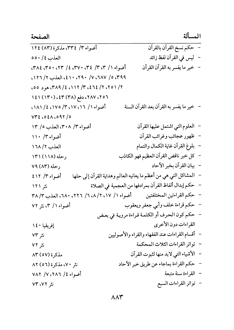 - العلوم التي اشتمل عليها القرآن ... أضواء ٣/ ٣٠٨، العذب ٥/ ١٣