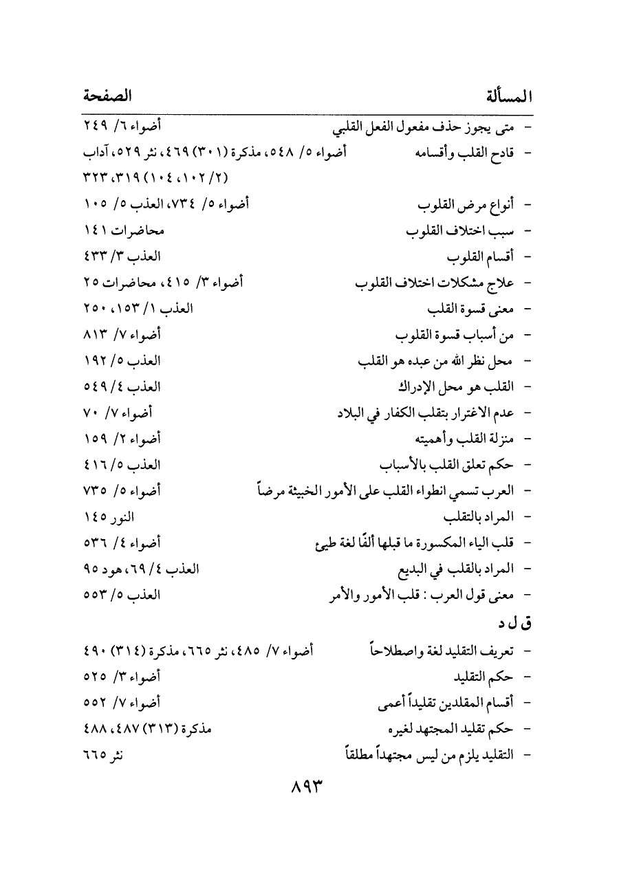 - قادح القلب وأقسامه ... أضواء ٥/ ٥٤٨، مذكرة (٣٠١) ٤٦٩، نثر ٥٢٩، آداب (٢/ ١٠٢، ١٠٤) ٣١٩، ٣٢٣