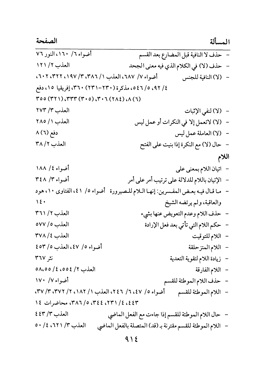 - (لا) النافية للجنس ... أضواء ٧/ ٦٨٧، العذب ١/ ٣٨٦، ٣/ ١٩٧، ٣٢٢، ٦٠٢، ٤/ ٩٢، ٥/ ٥٤٦، مذكرة (٢٣٠ - ٢٣١) ٣٦٠، إفريقيا ١٥، دفع (٦) ٨، (٢٨٤) ٣٠٦، (٣٠٥) ٣٣٣، (٣٢١) ٣٥٥