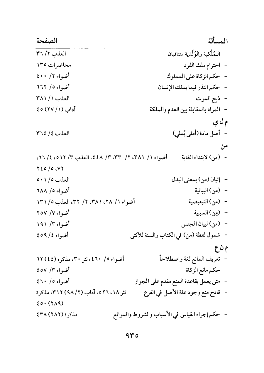 - (من) لابتداء الغاية ... أضواء ١/ ٣٨١، ٢/ ٣٣، ٣/ ٤٤٨، العذب ٣/ ٥١٢، ٤/ ٦٦، ٧٢، ٥/ ٢٤٥