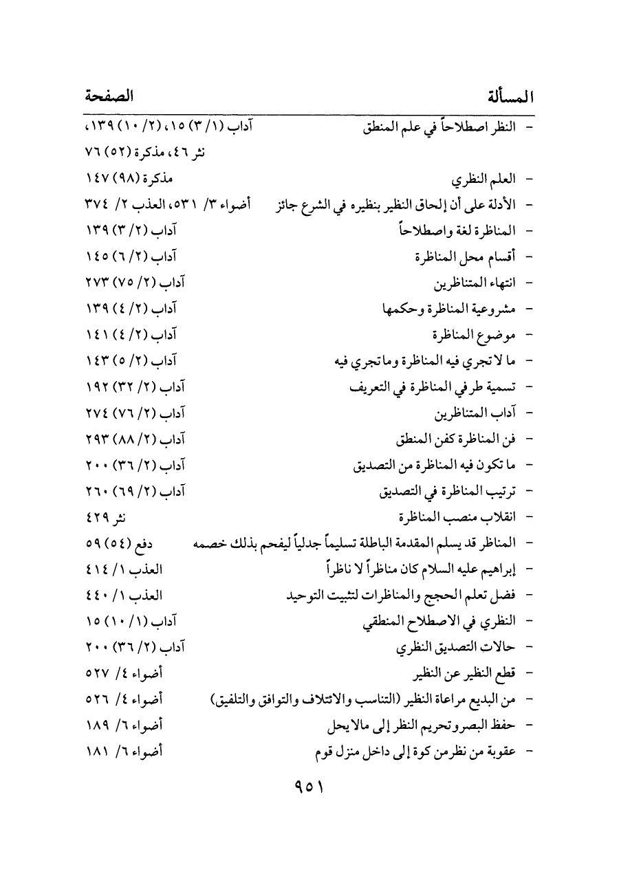 - النظر اصطلاحاً في علم المنطق ... آداب (١/ ٣) ١٥، (٢/ ١٠) ١٣٩، نثر ٤٦، مذكرة (٥٢) ٧٦