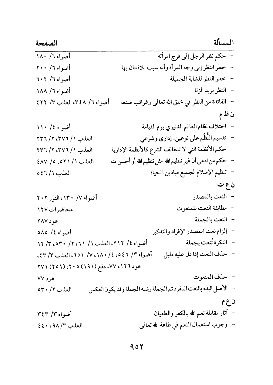 - حذف النعت إذا دل عليه دليل ... أضواء ٣/ ٥٤٦، ٤/ ١٨٠، ٧/ ٦٥١، العذب ٣/ ٤٣، هود ١٢٦، ٧٧، دفع (١٩١) ٢٠٥، (٢٥١) ٢٧١