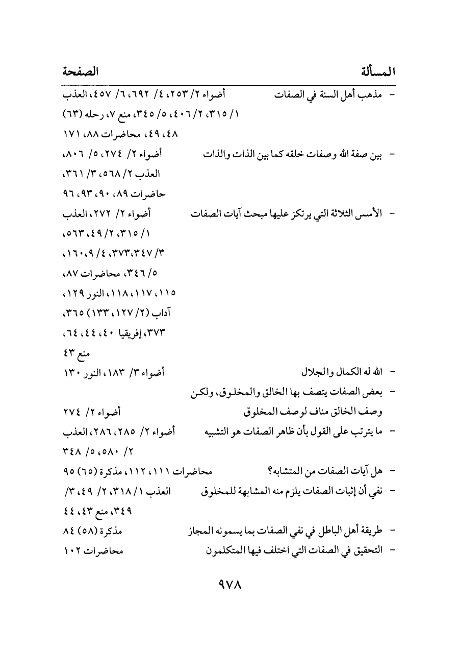 - الأسس الثلاثة التي يرتكز عليها مبحث آيات الصفات ... أضواء ٢/ ٢٧٢، العذب ١/ ٣١٥، ٢/ ٤٩، ٥٦٣، ٣/ ٣٧٣،٣٤٧، ٤/ ٩،١٦٠، ٥/ ٣٤٦، محاضرات ٨٧، ١١٥، ١١٧، ١١٨، النور ١٢٩، آداب (٢/ ١٢٧، ١٣٣) ٣٦٥، ٣٧٣، إفريقيا ٤٠، ٤٤، ٦٤، منع ٤٣