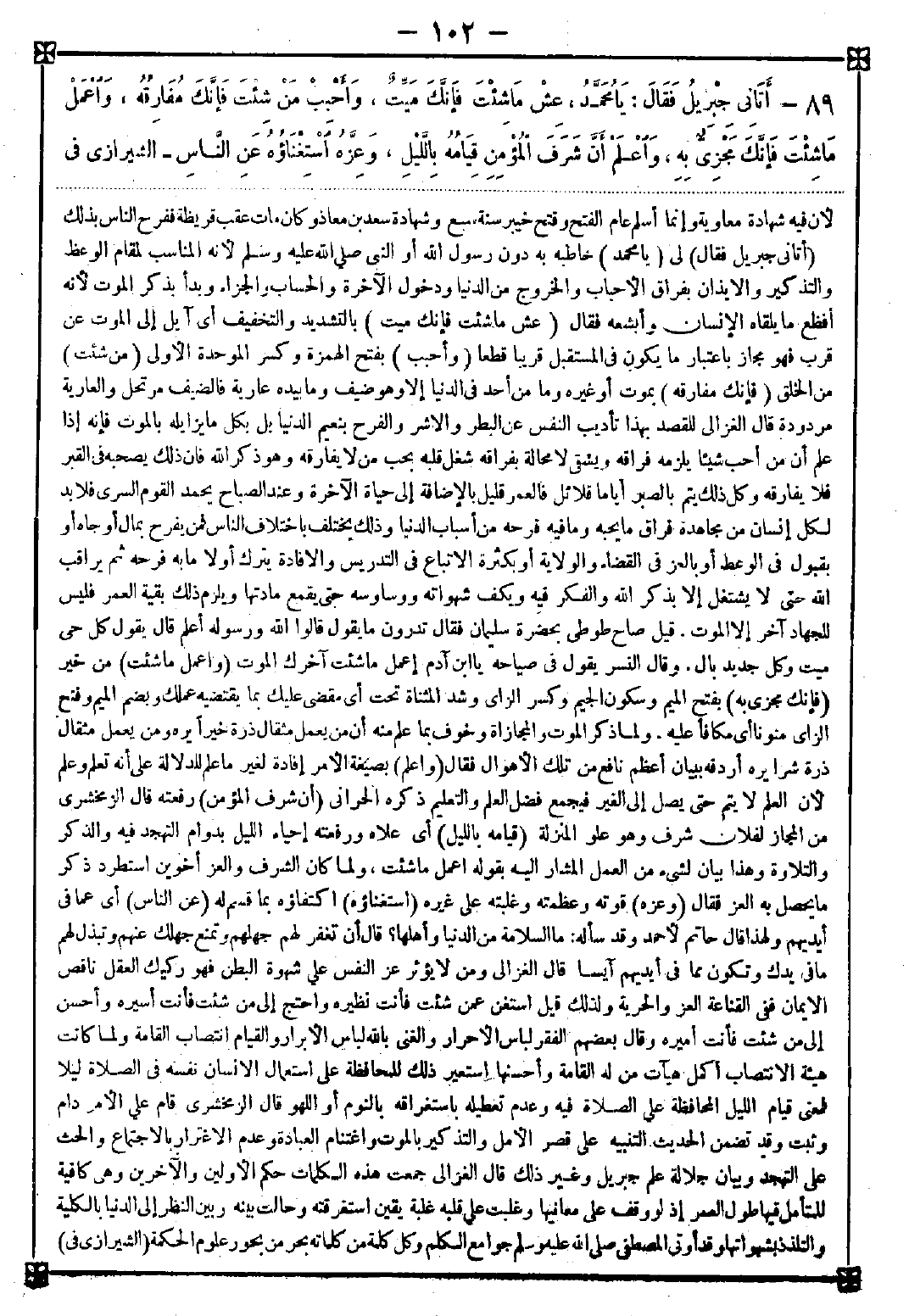 89 - (أتاني جبريل فقال) لي (يا محمد) خاطبه به دون رسول الله أو النبي صلى الله عليه وسلم لأنه المناسب لمقام الوعظ والتذكير والإيذان بفراق الأحباب والخروج من الدنيا ودخول الآخرة والحساب والجزاء وبدأ بذكر الموت لأنه أفظع ما يلقاه الإنسان وأبشعه فقال (عش ما شئت فإنك ميت) بالتشديد والتخفيف أي آيل إلى الموت عن قرب فهو مجاز باعتبار ما يكون في المستقبل قريبا قطعا (وأحبب) بفتح الهمزة وكسر الموحدة الأولى (من شئت) من الخلق (فإنك مفارقه) بموت أو غيره وما من أحد في الدنيا إلا وهو ضعيف وما بيده عارية فالضيف مرتحل والعارية مردودة قال الغزالي للقصد بهذا تأديب النفس عن البطر والأشر والفرح بنعيم الدنيا بل بكل ما يزايله بالموت فإنه إذا علم أن من أحب شيئا يلزمه فراقه ويشقى لا محالة بفراقه شغل قلبه بحب من لا يفارقه وهو ذكر الله فإن ذلك يصحبه في القبر فلا يفارقه وكل ذلك يتم بالصبر أياما قلائل فالعمر قليل بالإضافة إلى حياة الآخرة وعند الصباح يحمد القوم السرى فلا بد لكل إنسان من مجاهدة فراق ما يحبه وما فيه فرحه من أسباب الدنيا وذلك يختلف باختلاف الناس فمن يفرح بمال أو جاه أو بقبول في الوعظ أو بالعز في القضاء والولاية أو بكثرة الإتباع في التدريس والإفادة يترك أولا ما به فرحه ثم يراقب الله حتى لا يشتغل إلا بذكر الله والفكر فيه ويكف عن شهواته ووساوسه حتى يقمع مادتها ويلزم ذلك بقية العمر فليس للجهاد آخر إلا الموت. قيل صاح طوطي بحضرة سليمان فقال تدرون ما يقول قالوا الله ورسوله أعلم قال يقول كل حي ميت وكل جديد بال. وقال النسر يقول في صياحه يا ابن آدم اعمل ما شئت آخرك الموت (واعمل ما شئت) من خير (فإنك مجزي به) بفتح الميم وسكون الجيم وكسر الزاي وشد المثناة تحت أي مقضى عليك بما يقتضيه عملك وبضم الميم وفتح الزاي منونا أي مكافأ عليه. ولما ذكر الموت والمجازاة وخوف بما علم منه أن من يعمل مثقال ذرة خيرا يره ومن يعمل مثقال ذرة شرا يره أردفه ببيان أعظم نافع من تلك الأهوال فقال (واعلم) بصيغة الأمر إفادة لغير ما علم للدلالة على أنه تعلم وعلم لأن العلم لا يتم حتى يصل إلى الغير فيجمع فضل العلم والتعليم ذكره الحراني (أن شرف المؤمن) رفعته قال الزمخشري من المجاز لفلان شرف وهو علو المنزلة (قيامه بالليل) أي علاه ورفعته إحياء الليل بدوام التهجد فيه والذكر والتلاوة وهذا بيان لشيء من العمل المشار إليه بقوله اعمل ما شئت ولما كان الشرف والعز أخوين استطرد ذكر ما يحصل به العز فقال (وعزه) قوته وعظمته وغلبته على غيره (استغناؤه) اكتفاؤه بما قسم له (عن الناس) أي عما في أيديهم ولهذا قال حاتم لأحمد وقد سأله: ما السلامة من الدنيا وأهلها؟ قال: أن تغفر لهم جهلهم وتمنع جهلك عنهم وتبذل لهم ما في يدك وتكون مما في أيديهم آيسا قال الغزالي: ومن لا يؤثر عز النفس على شهوة البطن فهو ركيك العقل ناقص الإيمان ففي القناعة العز والحرية ولذلك قيل استغن عمن شئت فأنت نظيره واحتج إلى من شئت فأنت أسيره وأحسن إلى من شئت فأنت أميره وقال بعضهم: الفقر لباس الأحرار والغنى بالله لباس الأبرار والقيام انتصاب القامة ولما كانت هيئة الانتصاب أكمل هيآت من له القامة وأحسنها استعير ذلك للمحافظة على استعمال الإنسان نفسه في الصلاة ليلا فمعنى قيام الليل المحافظة على الصلاة فيه وعدم تعطيله باستغراقه بالنوم أو اللهو قال الزمخشري: قام على الأمر دام وثبت. وقد تضمن الحديث التنبيه على قصر الأمل والتذكير بالموت واغتنام العبادة وعدم الاغترار بالاجتماع والحث على التهجد وبيان جلالة علم جبريل وغير ذلك قال الغزالي: جمعت هذه الكلمات حكم الأولين والآخرين وهي كافية للمتأمل فيها طول العمر إذ لو وقف على معانيها وغلبت على قلبه غلبة يقين استغرقته وحالت بينه وبين النظر إلى الدنيا بالكلية والتلذذ بشهواتها وقد أوتي المصطفى صلى الله عليه وسلم جوامع الكلم وكل كلمة من كلماته بحر من بحور الحكمة