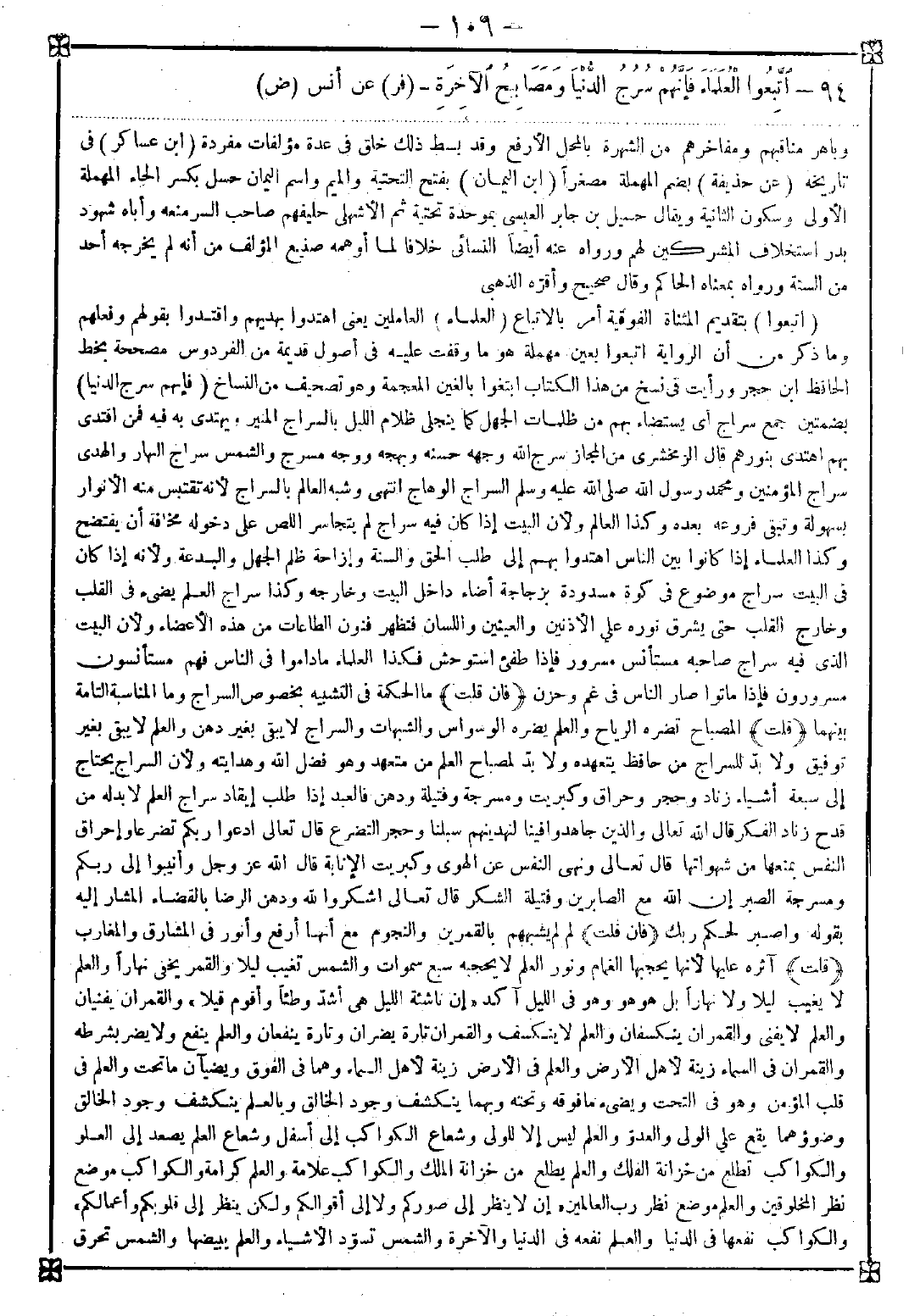 94 - (اتبعوا) بتقديم المثناة الفوقية أمر بالإتباع (العلماء) العاملين يعني اهتدوا بهديهم واقتدوا بقولهم وفعلهم وما ذكر من أن الرواية اتبعوا بعين مهملة هو ما وقفت عليه في أصول قديمة من الفردوس مصححة بخط الحافظ ابن حجر ورأيت في نسخ من هذا الكتاب ابتغوا بالغين المعجمة وهو تصحيف من النساخ (فإنهم سرج الدنيا) بضمنين جمع سراج أي يستضاء بهم من ظلمات الجهل كما ينجلي ظلام الليل بالسراج المنير. يهتدي به فيه فمن اقتدى بهم اهتدى بنورهم قال الزمخشري من المجاز سرج الله وجهه حسنه وبهجه ووجه مسرج والشمس سراج النهار والهدى سراج المؤمنين ومحمد رسول الله صلى الله عليه وسلم السراج الوهاج انتهى. وشبه العالم بالسراج لأنه تقتبس منه الأنوار بسهولة وتبقى فروعه بعده وكذا العالم ولأن البيت إذا كان فيه سراج لم يتجاسر اللص على دخوله مخافة أن يفتضح وكذا العلماء إذا كانوا بين الناس اهتدوا بهم إلى طلب الحق والسنة وإزاحة ظلم الجهل والبدعة ولأنه إذا كان في البيت سراج موضوع في كوة مسدودة بزجاجة أضاء داخل البيت وخارجه وكذا سراج العلم يضيء في القلب وخارج القلب حتى يرق نوره على الأذنين والعينين واللسان فتظهر فنون الطاعات من هذه الأعضاء ولأن البيت الذي فيه سراج صاحبه مستأنس مسرور فإذا طفئ استوحش فكذا العلماء ما داموا في الناس فهم مستأنسون مسرورون فإذا ماتوا صار الناس في غم وحزن (فإن قلت) ما الحكمة في التشبيه بخصوص السراج وما المناسبة التامة بينهما (قلت) المصباح تضره الرياح والعلم يضره الوسواس والشبهات والسراج لا يبقى بغير دهن والعلم لا يبقى بغير توفيق ولا بد للسراج من حافظ يتعهده ولا بد لمصباح العلم من متعهد وهو فضل الله وهدايته ولأن السراج يحتاج إلى سبعة أشياء زناد وحجر وحراق وكبريت ومسرجة وفتيلة ودهن فالعبد إذا طلب إيقاد سراج العلم لا بد له من قدح زناد الفكر قال الله تعالى {والذين جاهدوا فينا لنهدينهم سبلنا} وحجر التضرع قال تعالى {ادعوا ربكم تضرعا} وإحراق النفس بمنعها من شهواتها قال تعالى {ونهى النفس عن الهوى} وكبريت الإنابة قال الله عز وجل {وأنيبوا إلى ربكم} ومسرجة الصبر {إن الله مع الصابرين} وفتيلة الشكر قال تعالى {اشكروا لله} ودهن الرضا بالقضاء المشار إليه بقوله {واصبر لحكم ربك} (فإن قلت) لم لم يشبههم بالقمرين والنجوم مع أنها أرفع وأنور في المشارق والمغارب (قلت) آثره عليها لأنها يحجبها الغمام ونور العلم لا يحجبه سبع سماوات والشمس تغيب ليلا والقمر يختفي نهارا والعلم لا يغيب ليلا ولا نهارا بل هو هو وهو في الليل آكد {إن ناشئة الليل هي أشد وطئا وأقوم قيلا} والقمران يفنيان والعلم لا يفنى والقمران ينكسفان والعلم لا ينكسف والقمران تارة يضران وتارة ينفعان والعلم ينفع ولا يضر بشرطه والقمران في السماء زينة لأهل الأرض والعلم في الأرض زينة لأهل السماء وهما في الفوق ويضيآن ما تحت والعلم في قلب المؤمن وهو في التحت ويضيء ما فوقه وتحته وبهما بنكشف وجود الخالق وبالعلم ينكشف وجود الخالق وضوؤهما يقع على الولي والعدو والعلم ليس إلا للولي وشعاع الكواكب إلى أسفل وشعاع العلم يصعد إلى العلو والكواكب تطلع من خزانة الفلك والعلم يطلع من خزانة الملك والكواكب علامة والعلم كرامة والكواكب موضع نظر المخلوقين والعلم موضع نظر رب العالمين " إن الله لا ينظر إلى صوركم ولا إلى أقوالكم ولكن ينظر إلى قلوبكم وأعمالكم " الكواكب نفعها في الدنيا والعلم نفعه في الدنيا والآخرة والشمس تسود الأشياء والعلم يبيضها والشمس تحرق -[107]- والعلم ينجي من الحرق والقمر يبلي الثياب والعلم يجدد المعارف لأولي الألباب (ومصابيح الآخرة) جمع مصباح وهو السراج فمغايرة التعبير مع اتحاد المعنى للتفنن وقد يدعى أن المصباح أعظم فإن من السرج ما يضعف ضوؤه إذا قل سليطه ودقت فتيلته ومن كلامهم ثلاثة تضني: رسول بطئ وسراج لا يضيء ومائدة ينتظر لها من يجيء وهذا على طريق المجاز قال الزمخشري: من المجاز رأيت المصابيح تزهو في وجهه وإنما كانوا كالمصابيح في الآخرة لأن الناس يحتاجون 