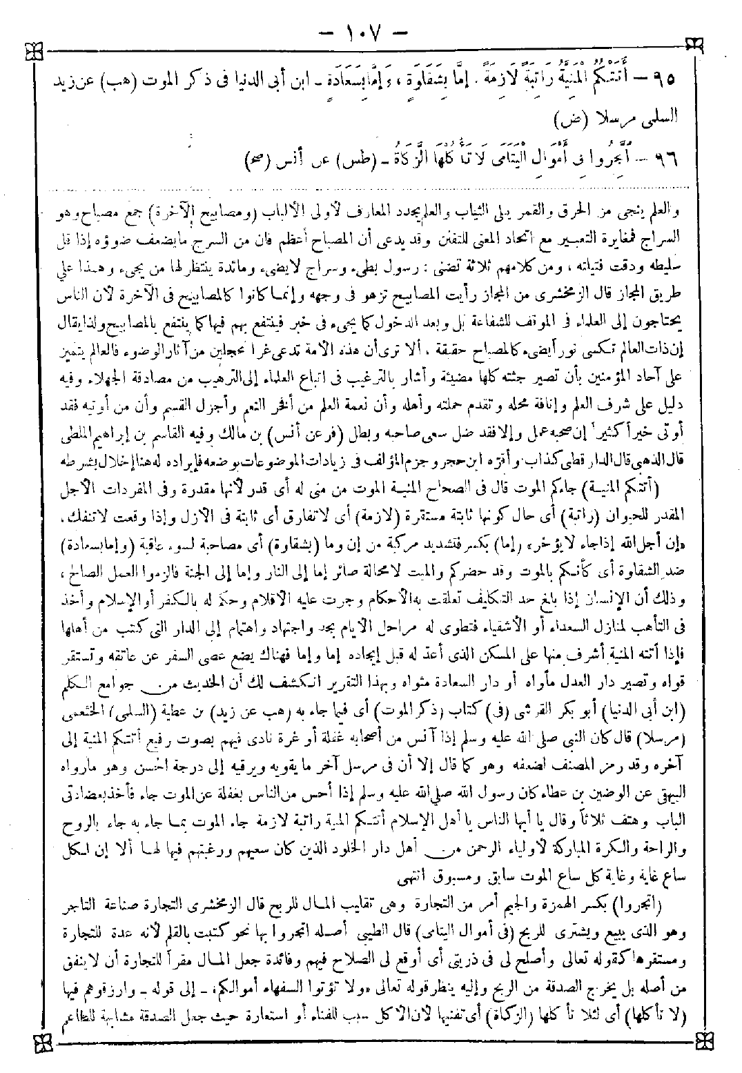 95 - (أتتكم المنية) جاءكم الموت قال في الصحاح: المنية الموت من منى له أي قدر لأنها مقدرة وفي المفردات الأجل المقدر للحيوان (راتبة) أي حال كونها ثابتة مستقرة (لازمة) أي لا تفارق أي ثابتة في الأزل وإذا وقعت لا تنفك. {إن أجل الله إذا جاء لا يؤخر} (إما) بكسر فتشديد مركبة من إن وما (بشقاوة) أي مصاحبة لسوء عاقبة (وإما بسعادة) ضد الشقاوة أي كأنكم بالموت وقد حضرتم والميت لا محالة صائر إما إلى النار وإما إلى الجنة فالزموا العمل الصالح وذلك أن الإنسان إذا بلغ حد التكليف تعلقت به الأحكام وجرت عليه الأقلام وحكم له بالكفر أو الإسلام وأخذ في التأهب لمنازل السعداء أو الأشقياء فتطوى له مراحل الأيام بجد واجتهاد واهتمام إلى الدار التي كتب من أهلها فإذا أتته المنية أشرف منها على المسكن الذي أعد له قبل إيجاده إما وإما فهناك يضع عصى السفر عن عاتقه وتستقر قواه وتصير دار العدل مأواه أو دار السعادة مثواه وبهذا التقرير انكشف لك أن الحديث من جوامع الكلم (ابن أبي الدنيا) أبو بكر القرشي (في) كتاب (ذكر الموت) أي فيما جاء به