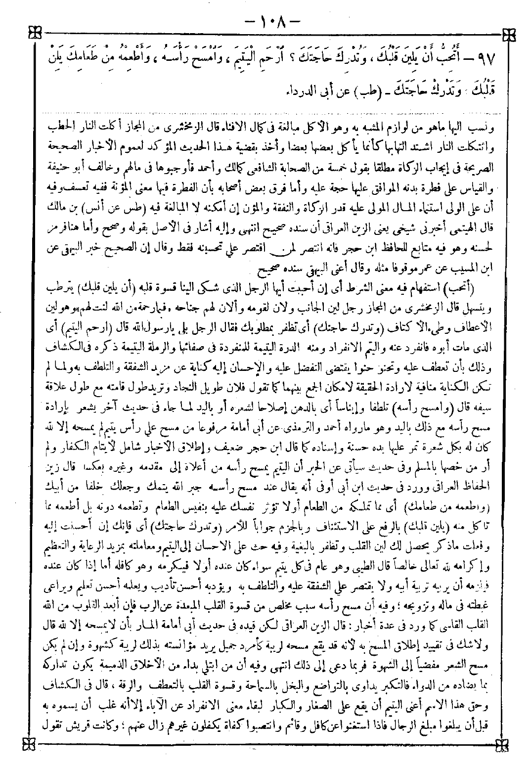 97 - (أتحب) استفهام فيه معنى الشرط أي إن أحببت أيها الرجل الذي شكى إلينا قسوة قلبه (أن يلين قلبك) يترطب ويتسهل قال الزمخشري: من المجاز رجل لين الجانب ولان لقومه وألان لهم جناحه {فبما رحمة من الله لنت لهم} وهو لين الأعطاف وطئ الأكتاف (وتدرك حاجتك) أي تظفر بمطلوبك فقال الرجل بلى يا رسول الله قال (ارحم اليتيم) أي الذي مات أبوه فانفرد عنه واليتم الانفراد ومنه الدرة اليتيمة للمنفردة في صفائها والرملة اليتيمة ذكره في الكشاف وذلك بأن تعطف عليه وتحنو حنوا يقتضي التفضل عليه والإحسان إليه كناية عن مزيد الشفقة والتلطف به. ولما لم تكن الكناية منافية لإرادة الحقيقة لإمكان الجمع بينهما كما تقول فلان طويل النجاد وتريد طول قامته مع طول علاقة سيفه قال (وامسح رأسه) تلطفا وإيناسا أي بالدهن إصلاحا لشعره أو باليد لما جاء في حديث آخر يشعر بإرادة مسح رأسه مع ذلك باليد وهو ما رواه أحمد والترمذي عن أبي أمامة مرفوعا من مسح على رأس اليتيم لم يمسحه إلا لله كان له بكل شعرة تمر عليها يده حسنة وإسناده كما قال ابن حجر ضعيف وإطلاق الأخبار شامل لأيتام الكفار ولم أر من خصها بالمسلم وفي حديث سيأتي عن الحبر أن اليتيم يمسح رأسه من أعلاه إلى مقدمه وغيره بعكسه قال زين الحافظ العراقي: وورد في حديث ابن أبي أوفى أنه يقال عند مسح رأسه جبر الله يتمك وجعلك خلفا من أبيك (وأطعمه من طعامك) أي مما تملكه من الطعام أو لا تؤثر نفسك عليه بنفيس الطعام وتطعمه دونه بل أطعمه مما تأكل منه (يلين قلبك) بالرفع على الاستئناف وبالجزم جوابا للأمر (وتدرك حاجتك) أي فإنك إن أحسنت إليه وفعلت ما ذكر يحصل لك لين القلب وتظفر بالبغية وفيه حث على الإحسان إلى اليتيم ومعاملته بمزيد الرعاية والتعظيم وإكرامه لله تعالى خالصا قال الطيبي وهو عام في كل يتيم سواء كان عنده أو لا فيكرمه وهو كافله أما إذا كان عنده فيلزمه أن يربيه تربية أبيه ولا يقتصر على الشفقة عليه والتلطف به ويؤدبه أحسن تأديب ويعلمه أحسن تعليم ويراعي غبطته في ماله وتزويجه وفيه أن مسح رأسه سبب مخلص من قسوة القلب المبعدة عن الرب فإن أبعد القلوب من الله القلب القاسي كما ورد في عدة أخبار قال الزين العراقي لكن قيده في حديث أبي أمامة المار بأن لا يمسحه إلا لله قال ولا شك في تقييد إطلاق المسح به لأنه قد يقع مسحه لريبة كأمرد جميل يريد مؤانسته بذلك لريبة كشهوة وإن لم يكن مسح الشعر مفضيا إلى الشهوة فربما دعى إلى ذلك انتهى وفيه أن من ابتلي بداء من الأخلاق الذميمة يكون تداركه بما يضاده من الدواء فالتكبر يداوى بالتواضع والبخل بالسماحة وقسوة القلب بالتعطف والرقة قال في الكشاف وحق هذا الاسم أعني اليتيم أن يقع على الصغار والكبار لبقاء معنى الانفراد عن الآباء إلا أنه غلب أن يسموه به قبل أن يبلغوا مبلغ الرجال فإذا استغنوا عن كافل وقائم وانتصبوا كفاة يكفلون غيرهم زال عنهم وكانت قريش تقول -[109]- لرسول الله صلى الله عليه وسلم يتيم آل أبي طالب على القياس أو حكاية حال كان عليها صغيرا توصيفا له وأما خبر " لا يتم بعد احتلام " فما هو إلا تعليم شريعة لا لغة يعني أنه إذا احتلم لم تجر عليه أحكام الصغار انتهى