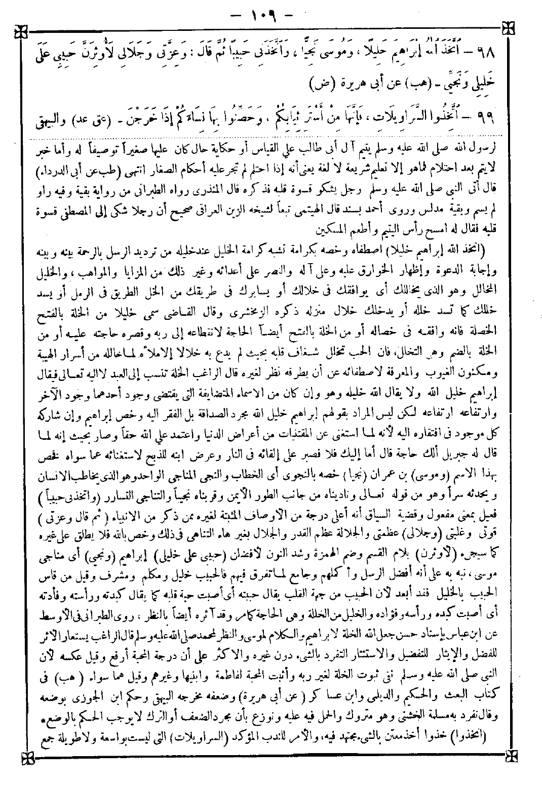 98 - (اتخذ الله إبراهيم خليلا) اصطفاه وخصه بكرامة تشبه كرامة الخليل عند خليله من تردد الرسل بالرحمة بينه وبينه وإجابة الدعوة وإظهار الخوارق عليه وعلى آله والنصر على أعدائه وغير ذلك من المزايا والمواهب والخليل المخالل وهو الذي يخاللك أي يوافقك في خلالك أو يسايرك في طريقك من الخل الطريق في الرمل أو يسد خللك كما تسد خلله أو يدخلك خلال منزله ذكره الزمخشري وقال القاضي سمي خليلا من الخلة بالفتح الخصلة فإنه وافقه في خصاله أو من الخلة بالفتح أيضا الحاجة لانقطاعه إلى ربه وقصره حاجته عليه أو من الخلة بالضم وهي التخلل فإن الحب تخلل شغاف قلبه بحيث لم يدع به خلالا إلا ملأه لما خالله من أسرار الهيبة ومكنون الغيوب والمعرفة لاصطفائه عن أن يطرقه نظر لغيره قال الراغب: الخلة تنسب إلى العبد لا إليه تعالى فيقال إبراهيم خليل الله ولا يقال الله خليله وهو وإن كان من الأسماء المتضايفة التي يقتضي وجود أحدهما وجود الآخر وارتفاعه ارتفاعه لكن ليس المراد بقولهم إبراهيم خليل الله مجرد الصداقة بل الفقر إليه وخص إبراهيم وإن شاركه كل موجود في افتقاره إليه لأنه لما استغنى عن المقتنيات من أعراض الدنيا واعتمد على الله حقا وصار بحيث إنه لما قال له جبريل ألك حاجة قال أما إليك فلا فصبر على إلقائه في النار وعرض ابنه للذبح لاستغنائه عما سواه فخص بهذا الاسم (وموسى) بن عمران (نجيا) خصه بالنجوى أي الخطاب والنجي المناجي الواحد وهو الذي يخاطب الإنسان ويحدثه سرا وهو من قوله تعالى {وناديناه من جانب الطور الأيمن وقربناه نجيا} والتناجي التساور (واتخذني حبيبا) فعيل بمعنى مفعول وقضية السياق أنه أعلى درجة من الأوصاف المثبتة لغيره ممن ذكر من الأنبياء (ثم قال وعزتي) قوتي وغلبتي (وجلالي) عظمتي والجلالة عظم القدر والجلال بغير هاء التناهي في ذلك وخص بالله فلا يطلق على غيره كما سيجيء (لأوثرن) بلام القسم وضم الهمزة وشد النون لأفضلن (حبيبي على خليلي) إبراهيم (ونجيي) أي مناجي موسى نبه به على أنه أفضل الرسل وأكملهم وجامع لما تفرق فيهم فالحبيب خليل ومكلم ومشرف وقيل من قاس الحبيب بالخليل فقد أبعد لأن الحبيب من جهة القلب يقال حببته أي أصبت حبه قلبه كما يقال كبدته ورأسته وفأدته أي أصبت كبده ورأسه وفؤاده والخليل من الخلة وهي الحاجة كما مر وقد آثره أيضا بالنظر روى الطبراني في الأوسط عن ابن عباس بإسناد حسن جعل الله الخلة لإبراهيم والكلام لموسى والنظر لمحمد صلى الله عليه وسلم قال الراغب يستعار الأثر للفضل والإيثار للتفضيل والاستئثار للتفرد بالشيء دون غيره والأكثر على أن درجة المحبة أرفع وقيل عكسه لأن النبي صلى الله عليه وسلم نفى ثبوت الخلة لغير ربه وأثبت المحبة لفاطمة وابنيها وغيرهم وقيل هما سواء